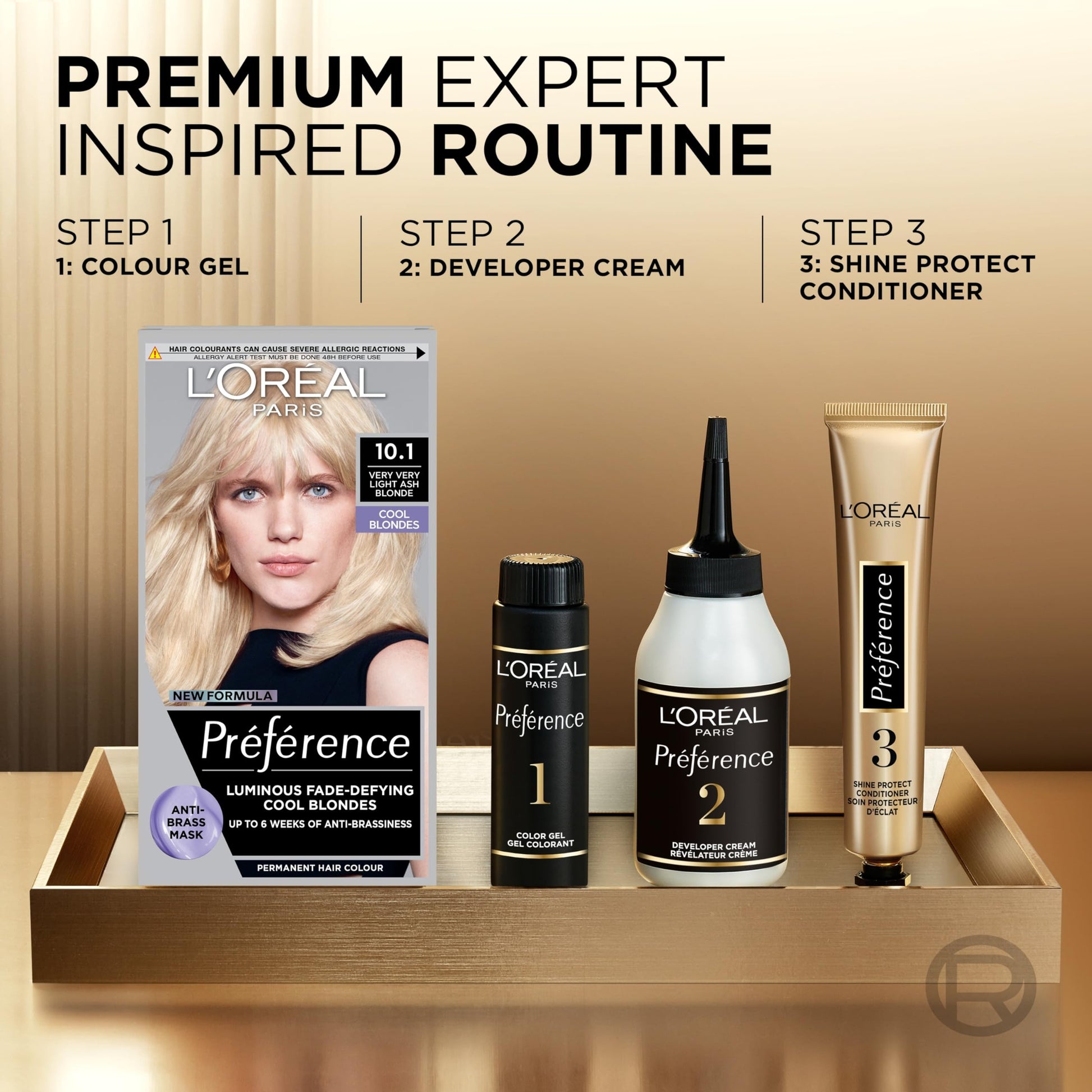 - Contents: 1x L'Oréal Paris Preference permanent hair colour in 10.1 Helsinki, Each box includes: 1x caring colourant crème, 1x developer crème, 1x anti-brassiness mask, 1x pair of protective gloves