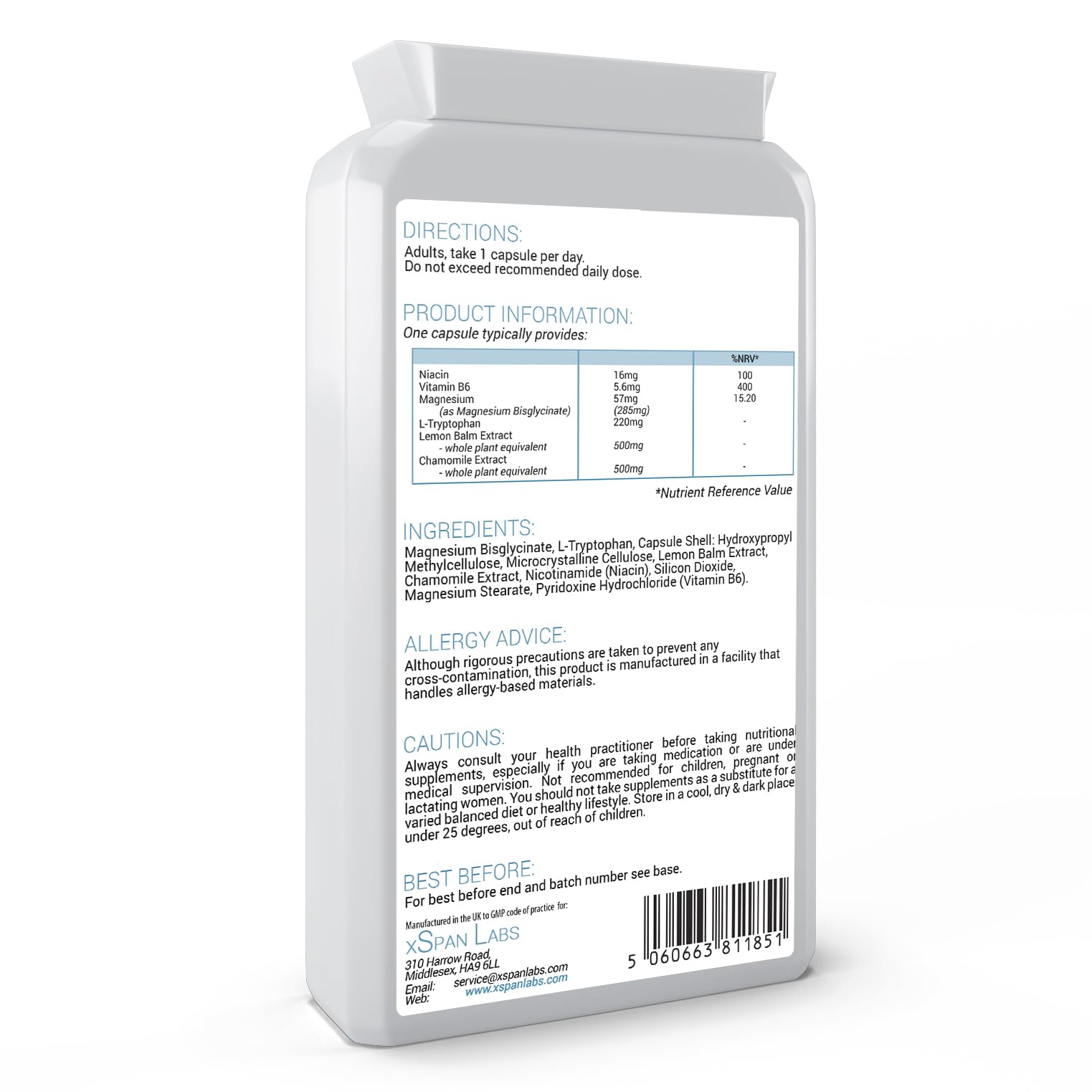 L-Tryptophan Sleep Complex with Lemon Balm & Chamomile and added Magnesium, Niacin & Vitamin B6 - 120 capsules/ 4 month supply - Manufactured in the UK:- designed to contribute to the normal functioning of the nervous system