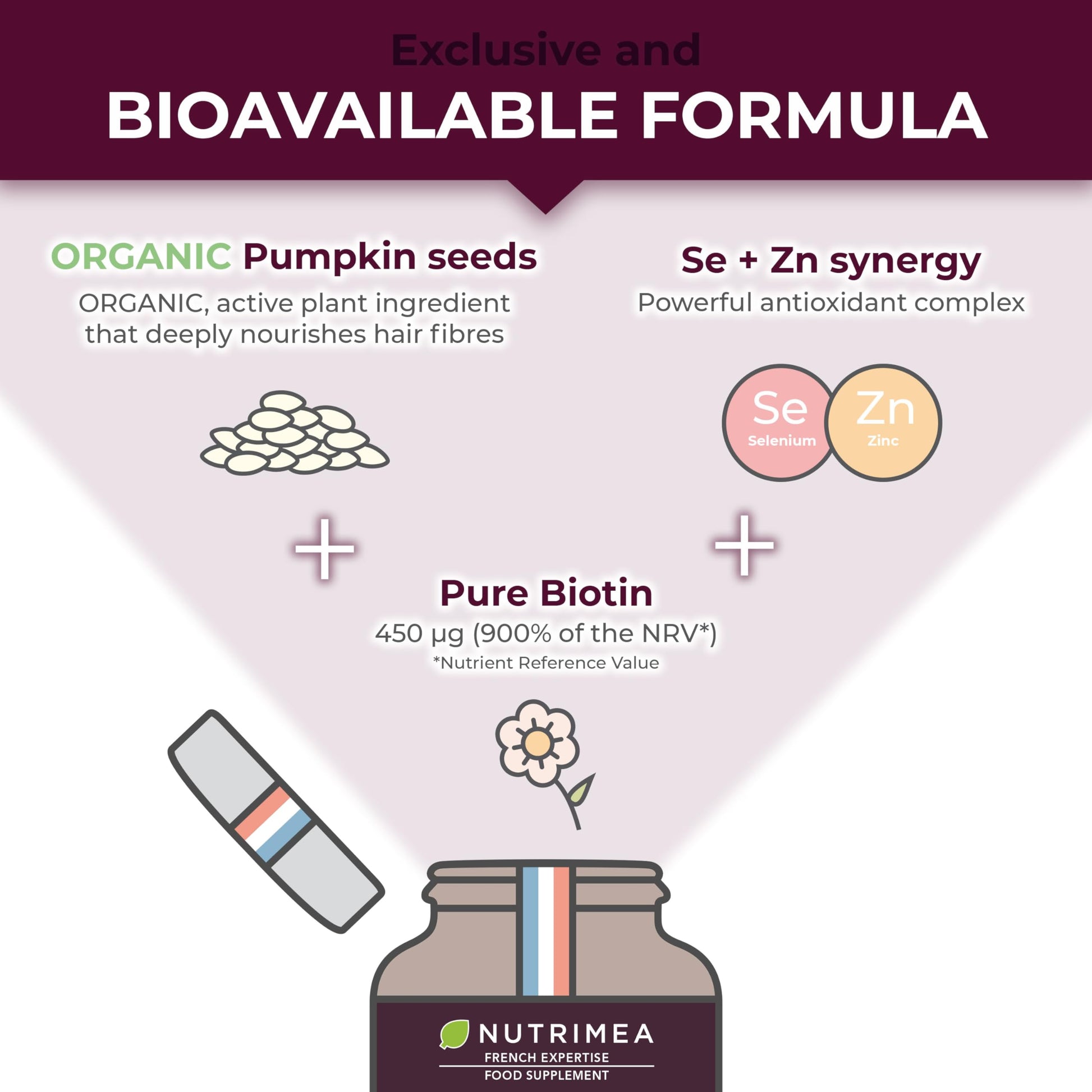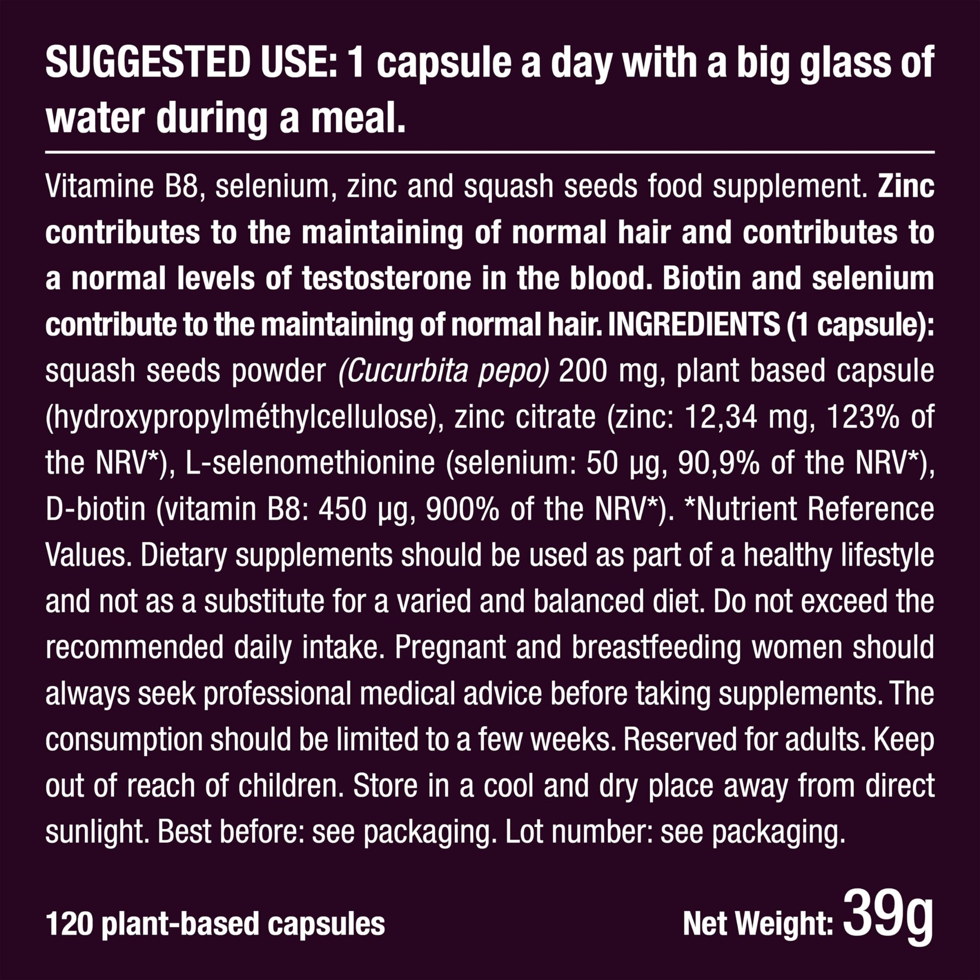 - ●● NEW EXCIPIENT-FREE FORMULA ●● For even more visible effects, our formula is enriched with pumpkin seeds, a natural active ingredient giving a beautiful natural colour to the capsules. To benefit from optimal results, we recommend a 4-month course of treatment.