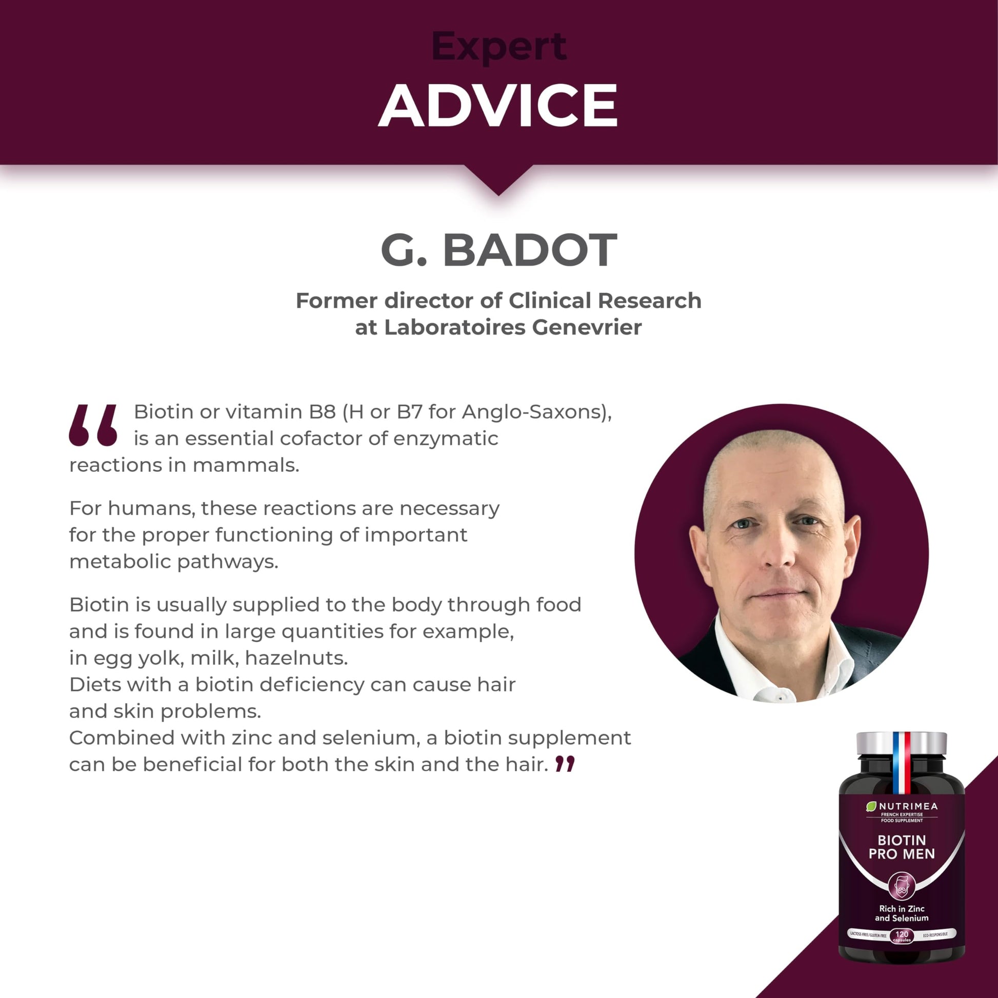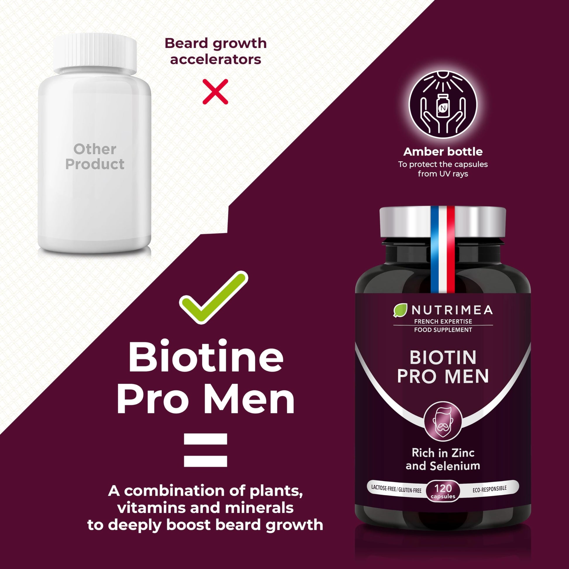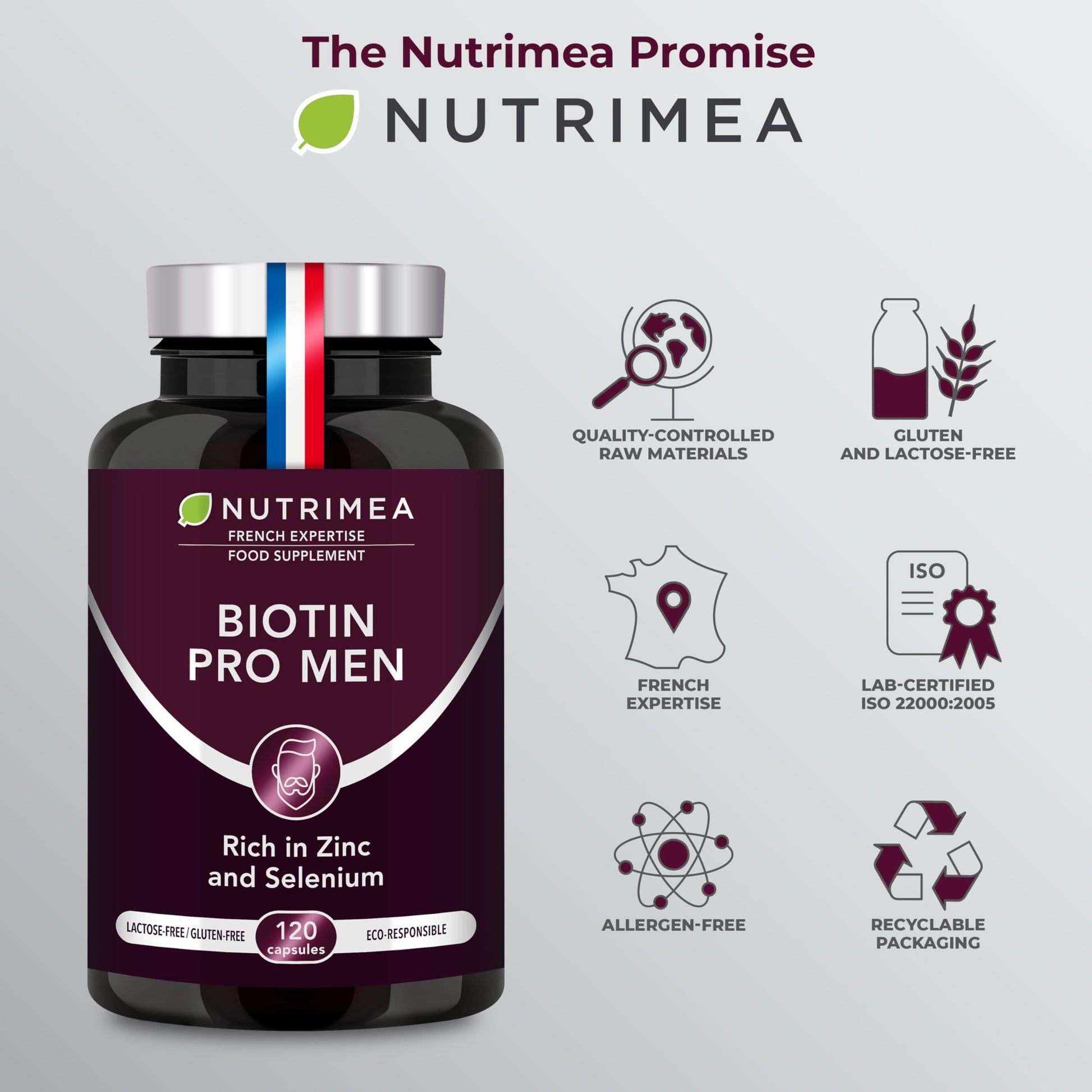 - ●● THE NUTRIMEA PROMISE ●● Our formula is based on a rigorous selection of the best ingredients in order to offer you a more complete product that acts in depth. Biotine pro men is formulated in the purest possible way: GMO-free, gluten-free and excipient-free. This product can be consumed after the date indicated on the product.