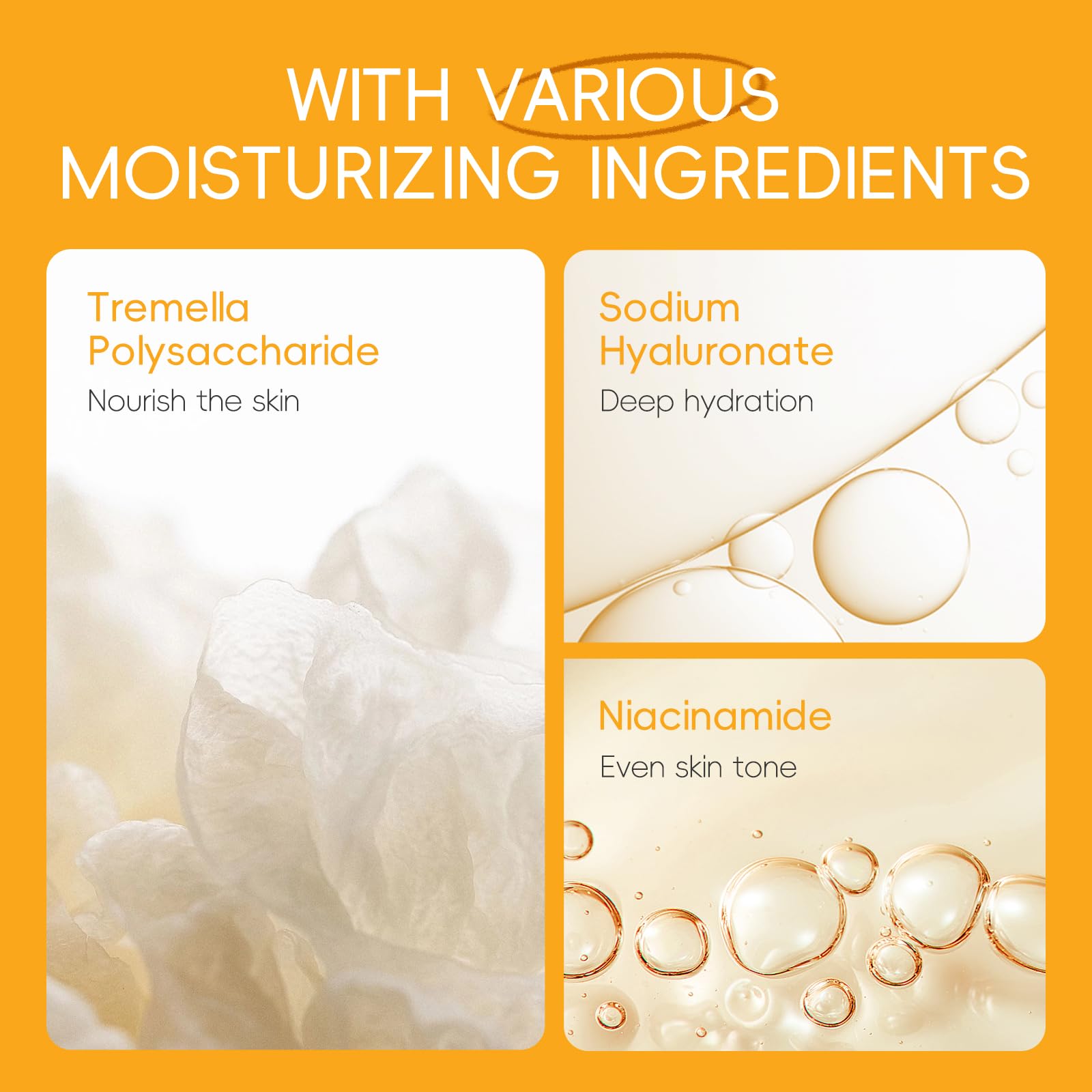 Face Cream: Evens skin tone and enhances elasticity with Vitamin C, Niacinamide, and Pearl Powder.