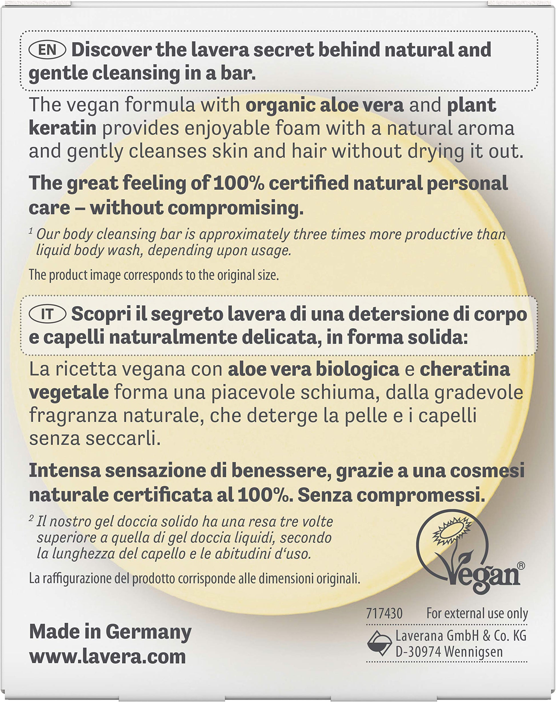 lavera solid shower 2 in 1 basis sensitiv Hydro Feeling - with organic aloe vera and plant keratin - cleans without drying out - 3x more productive than liquid shower gel - natural cosmetics - 50g
