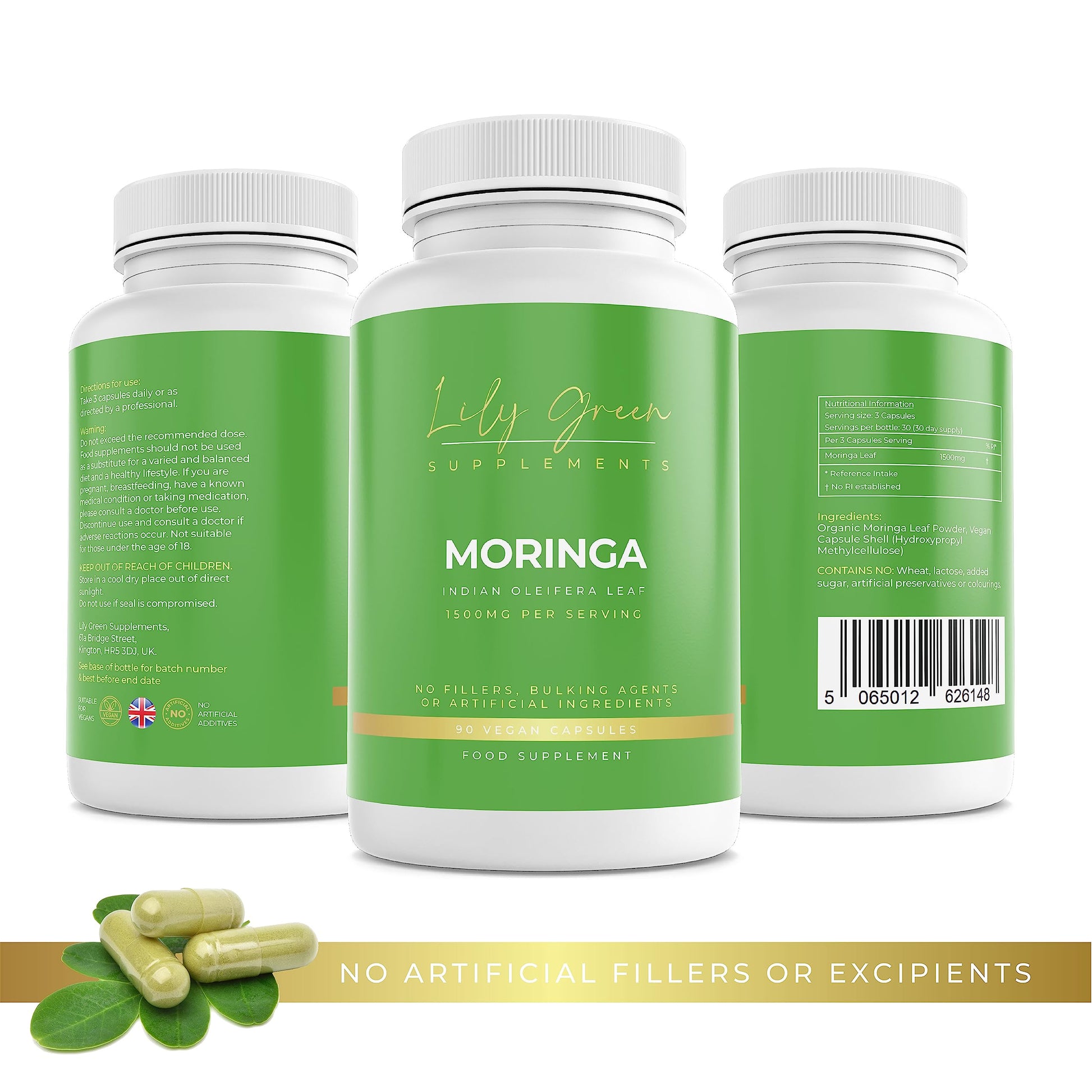Lily Green | Organic Moringa 1500mg per Serving | 90 Vegan Capsules | Rich in Vitamin C, Calcium, Iron, Potassium & Antioxidants | No Artificial Additives | Made in UK