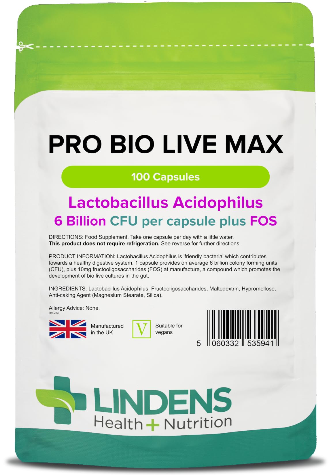 - TRIED & TRUSTED QUALITY — Lindens Health + Nutrition is leading the way in consumer nutrition supplements. Our Pro Bio Live capsules are packaged in foil-fresh, resealable and light-proof pouches and manufactured in the UK!