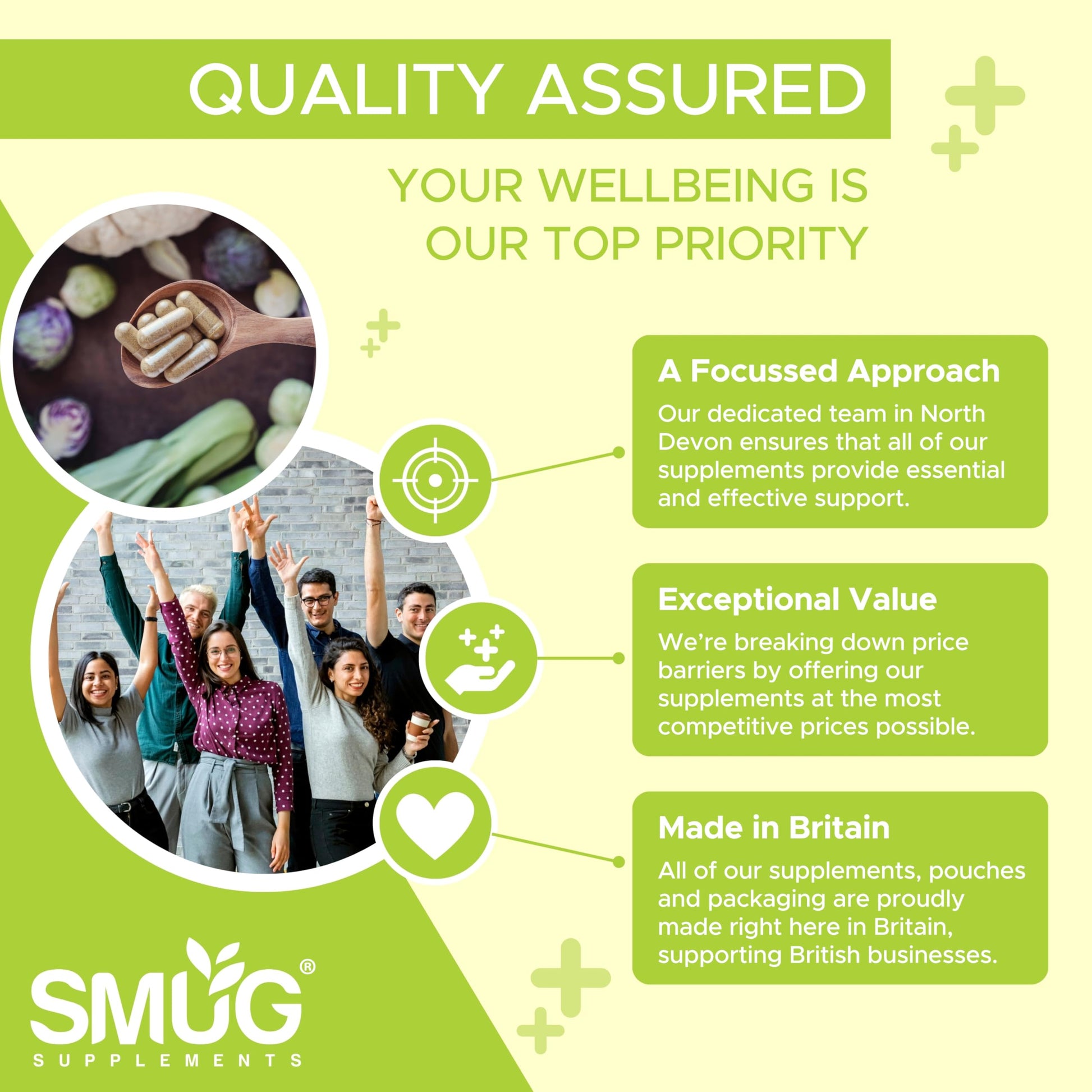 🇬🇧 PROUDLY BRITISH-MADE - Manufactured right here in Britain, SMUG Supplements are proud members of the Made in Britain organisation, committed to delivering only the finest British-made products. We only use additives when they are completely necessary to enhance the freshness or consistency of the active ingredients.