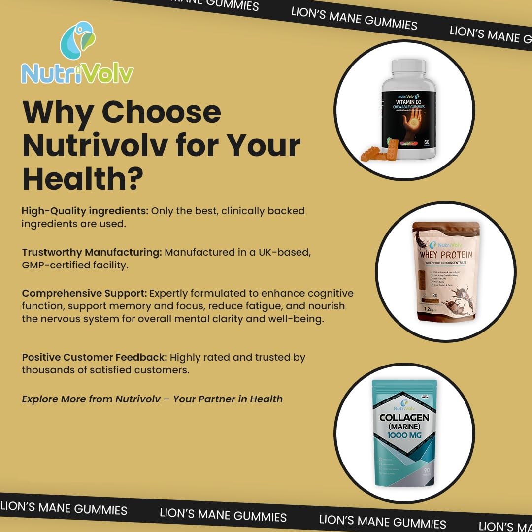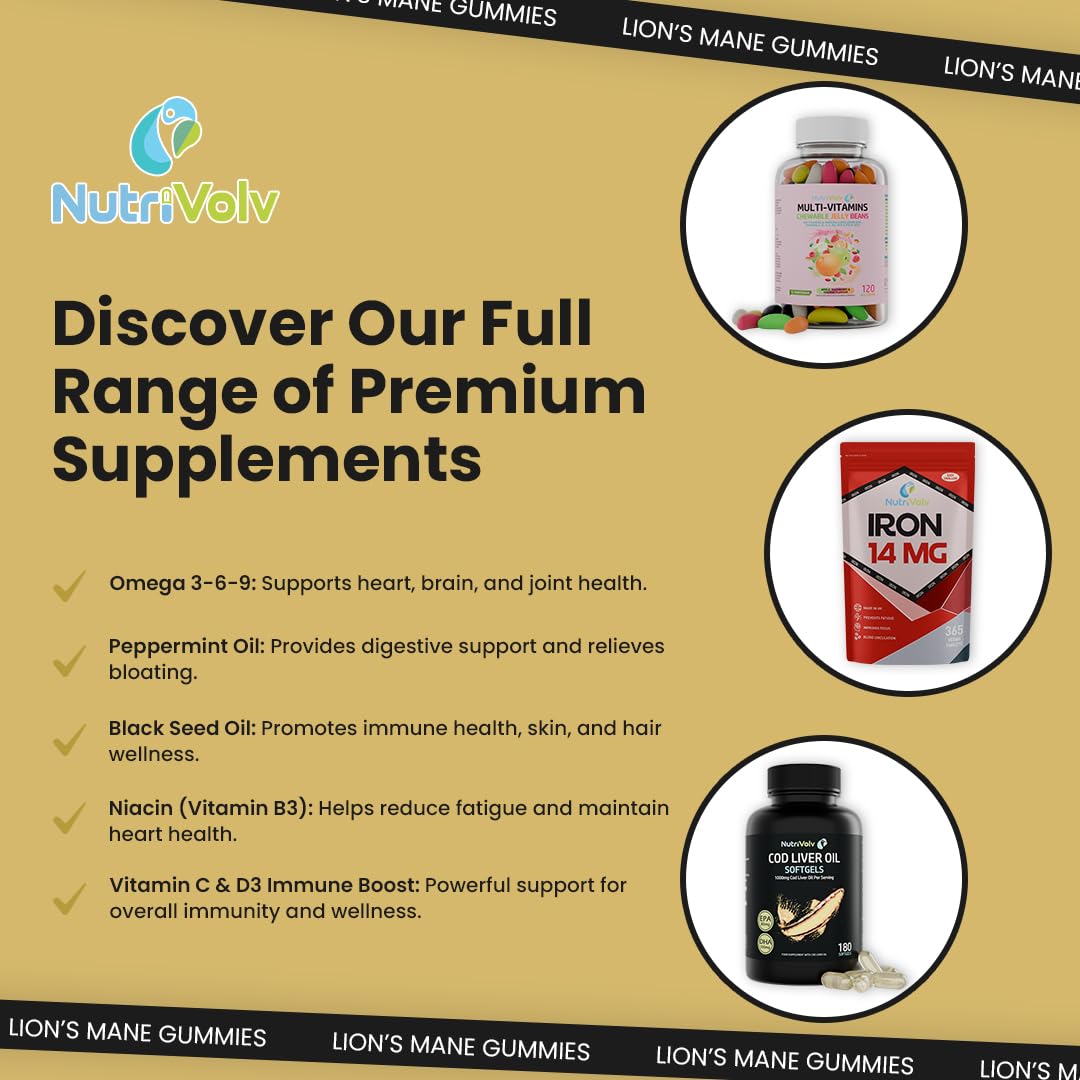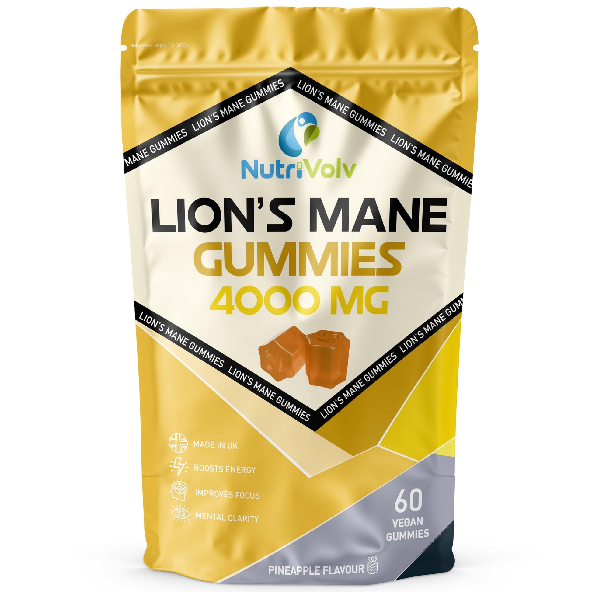 NutriVolv Lion’s Mane 4000mg Gummies offer a convenient and delicious way to support your wellness goals with the natural power of this revered mushroom. Packed with a high-strength 4000mg dose of premium lion’s mane extract per serving, these pineapple-flavoured gummies make your daily supplement routine enjoyable and hassle-free. Known for its traditional use in supporting focus, clarity, and wellbeing, lion’s mane has become a popular choice among those seeking a natural nootropic supplement in a tasty and chewable form. Whether you're looking for lion's mane mushroom gummies for memory and focus or to support overall wellness, these easy-to-take gummies are a great addition to any lifestyle. NutriVolv Lion's Mane Gummies are designed to cater to busy individuals looking for a brain support supplement without the fuss of powders or capsules. Perfect for students, professionals, and anyone who values mental clarity, these gummies provide an alternative way to incorporate this popular functional mushroom into your routine. As a vegan-friendly option with a fruity pineapple taste, they’re ideal for those seeking ease of use with maximum effectiveness. Each pack contains 60 gummies, giving you a full month's supply at the recommended two-a-day serving. These high-quality lion's mane extract gummies are made to high standards, suitable for men and women, and free from artificial colours and preservatives. Whether you’re trying to support cognitive wellness or looking for a convenient daily lion’s mane supplement, our gummies deliver functionality, flavour and simplicity in every chew. Experience the NutriVolv difference with this delicious and functional brain support gummy today.More Info