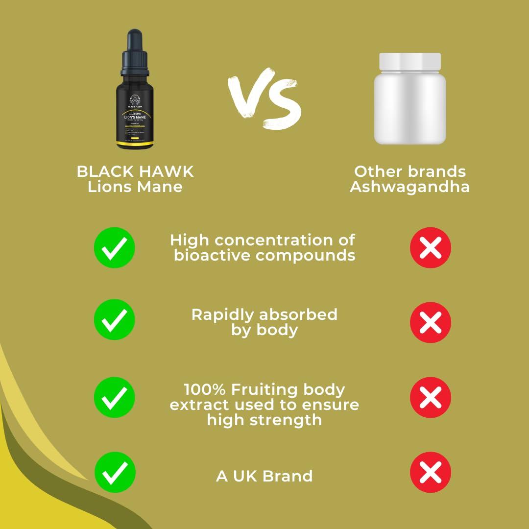 Lions Mane Supplement Liquid 1000mg - 60 Vegan Servings High Strength Lions Mane Mushroom Fruiting Body Extract - 2 Months Supply - Nootropic - Made in The UK by BLACK HAWK