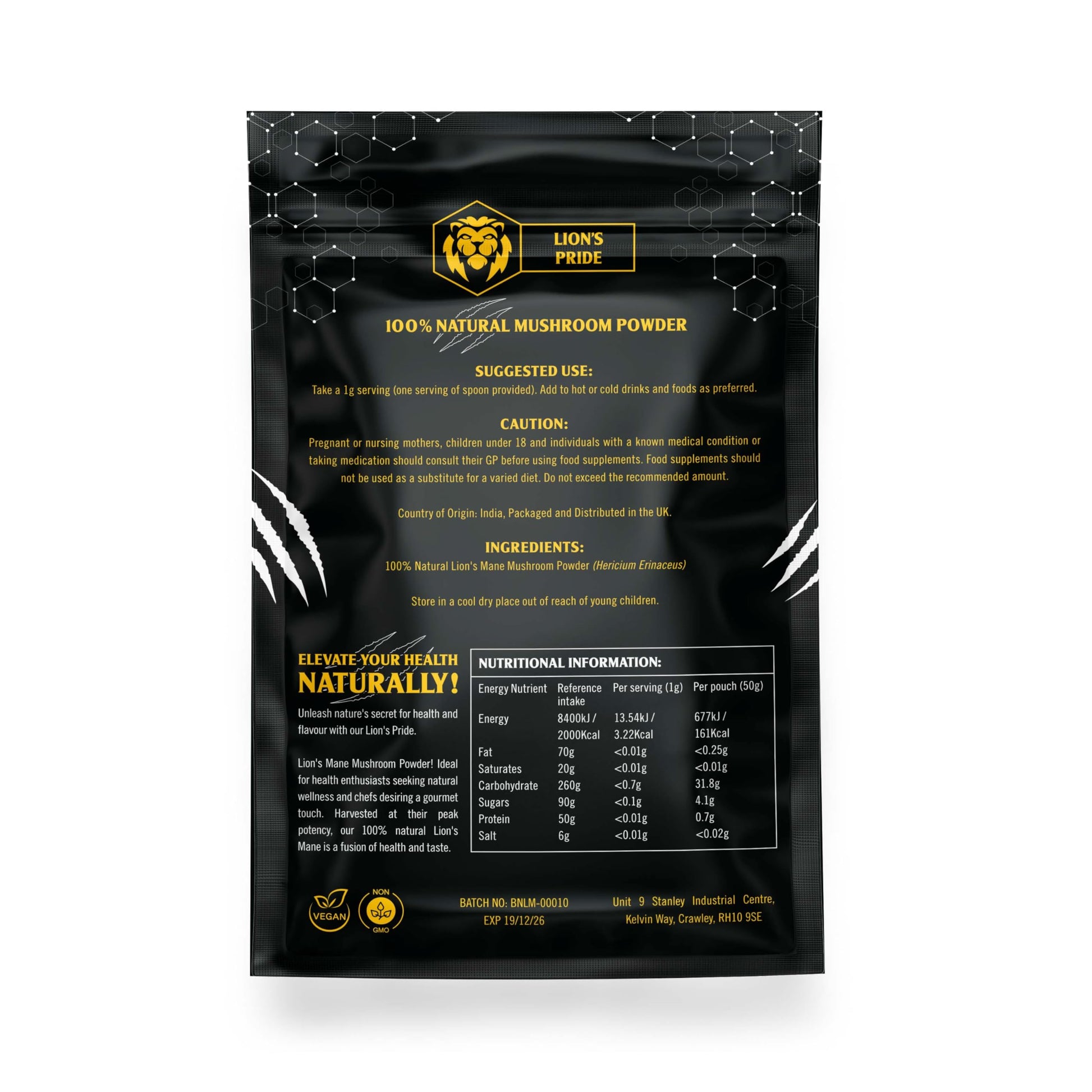Lions Mane Supplement Powder - Lions Pride Lions Mane Supplement High Strength - 100% Pure Lion's Mane Supplement with 50% Polysaccharides / 30% Beta Glucan - UK Lion's Mane Mushroom (50, Grams)