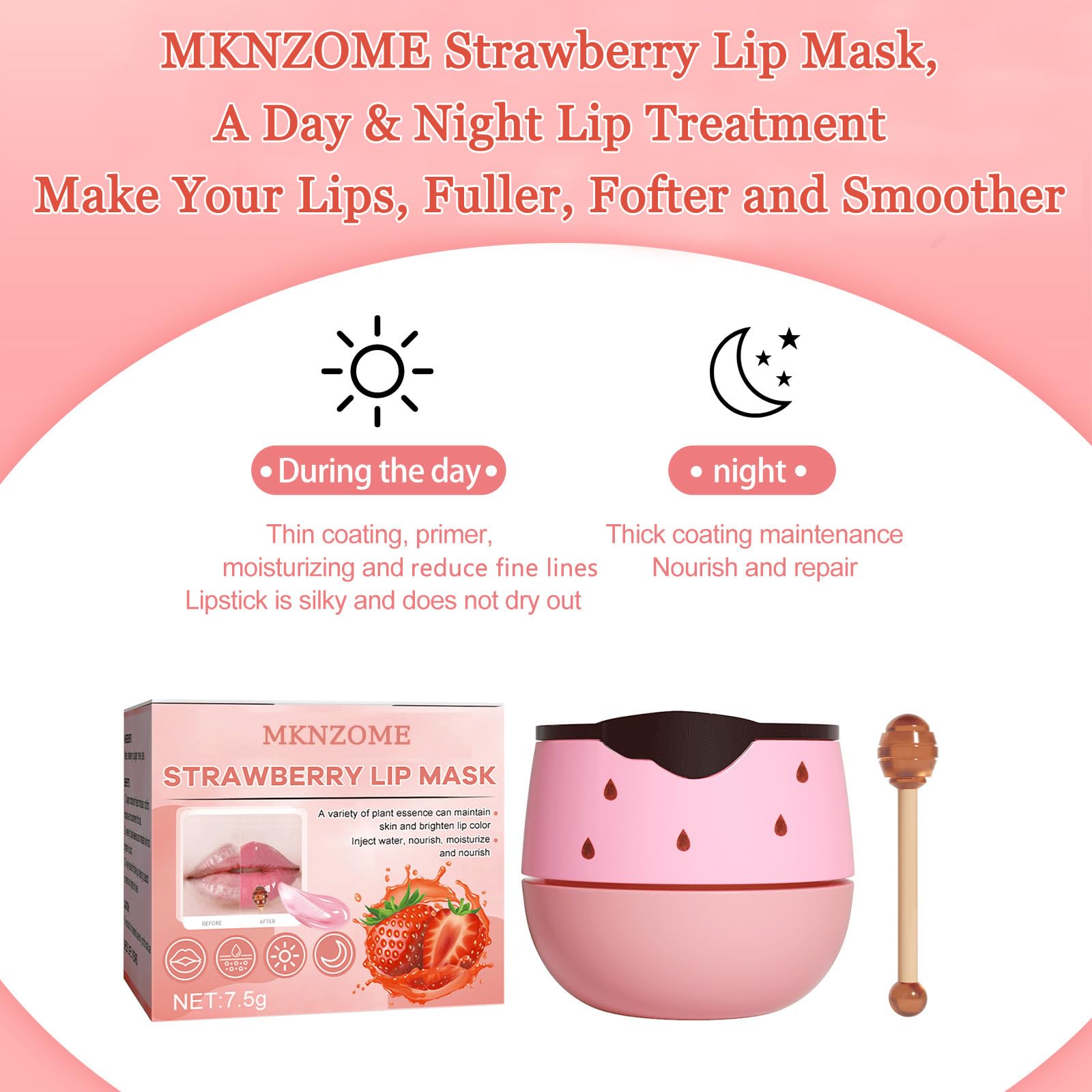 -->MKNZOME lip care kit can be used during the day or at night.One night care is equivalent to about 10 day care.Especially if you like to wear lipstick during the day, give your lips a SPA at night to make lips look more attractive the next day.