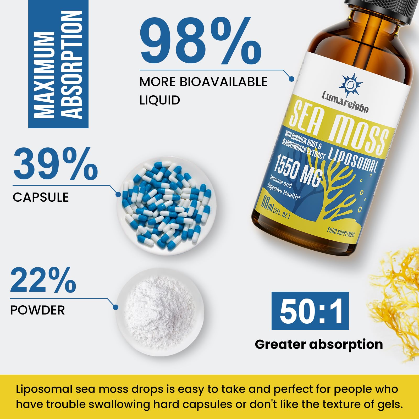 Liposomal Irish Sea Moss Drops 1550MG, with Burdock Root and Bladderwrack Extract, 4X Stronger Than Pills & Gel, Support Gut & Immune Health (Pack of 1)