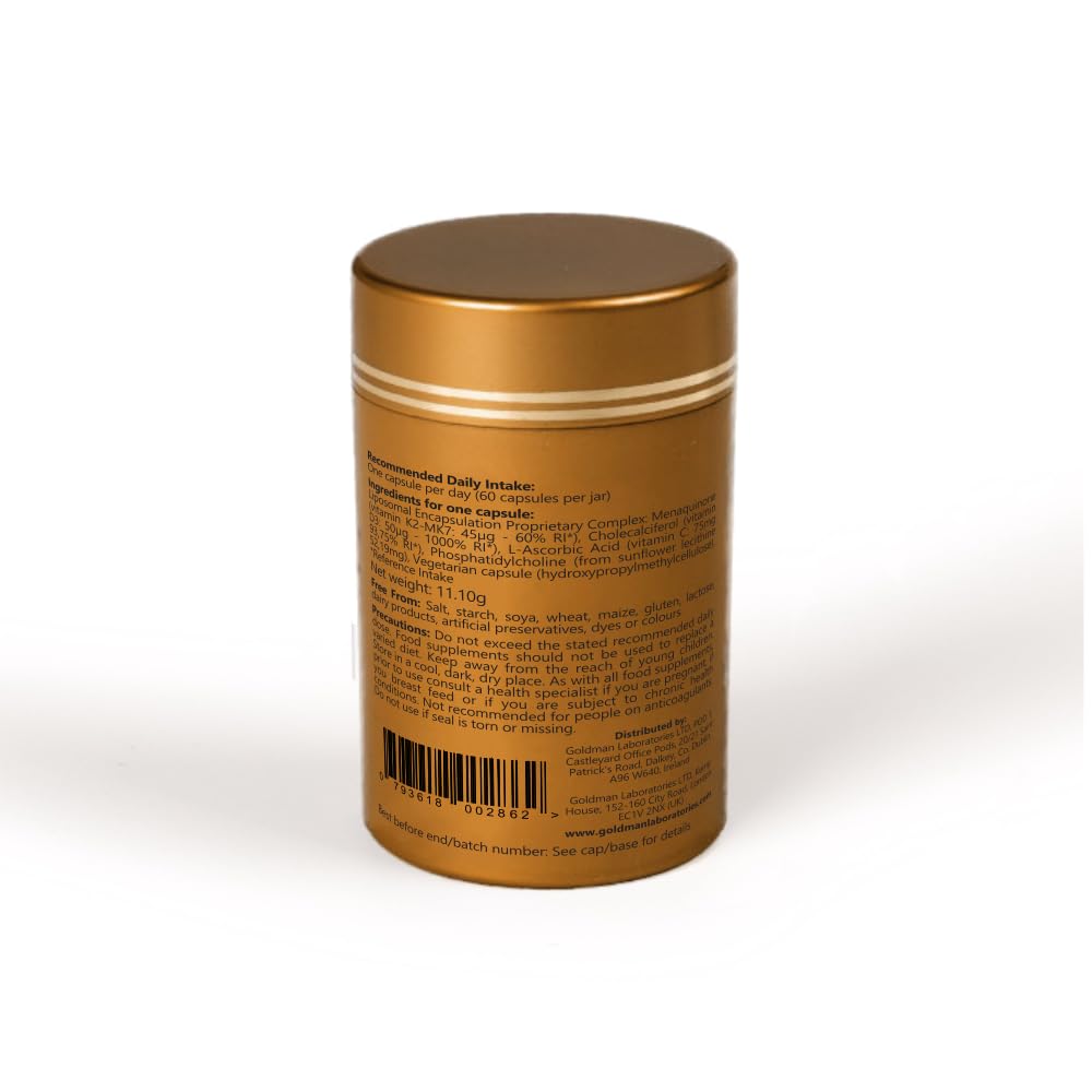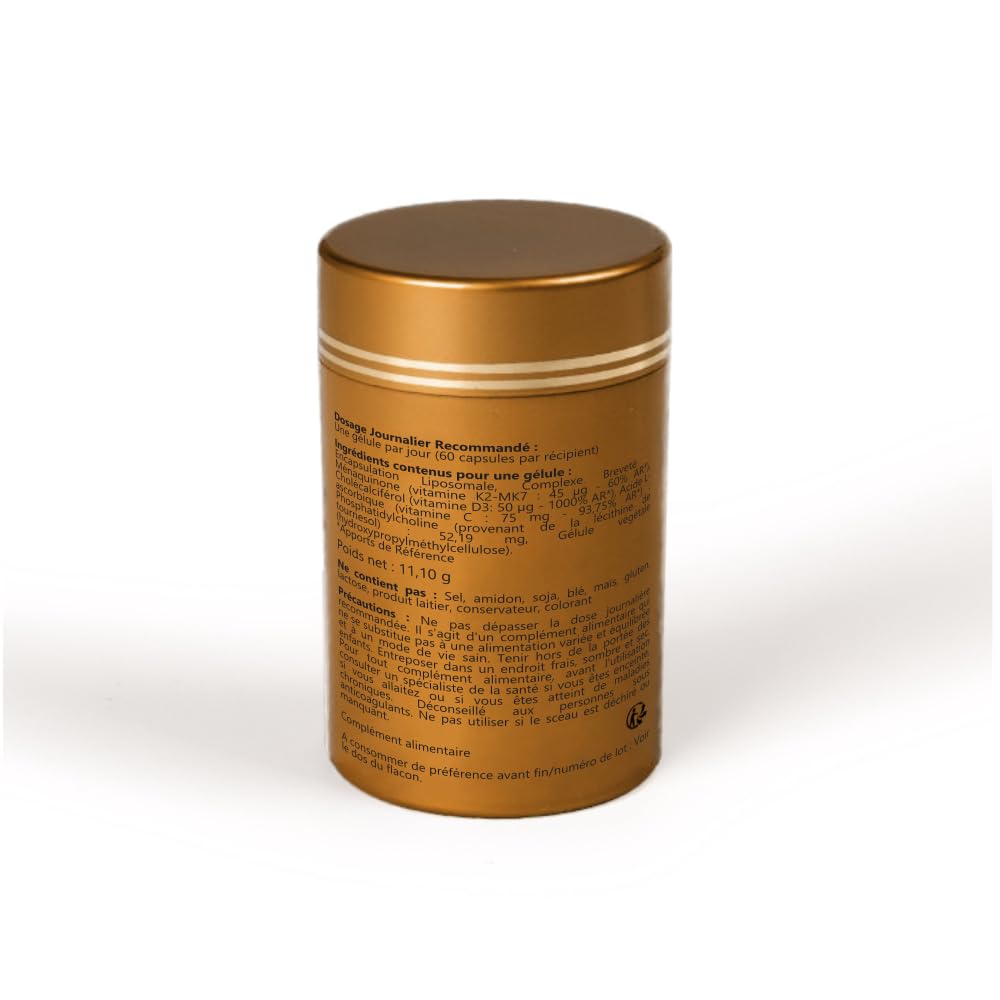 Liposomal Encapsulation, Patented Complex: Menaquinone (vitamin K2-MK7: 45 μg - 60% AR*), Cholecalciferol (vitamin D3: 50 μg - 1000% AR*), L-Ascorbic Acid (vitamin C: 75 mg - 93.75% AR*); Phosphatidylcholine (from sunflower lecithin): 52.19 mg, Vegetable capsule (hydroxypropylmethylcellulose). *RR: Reference intakes