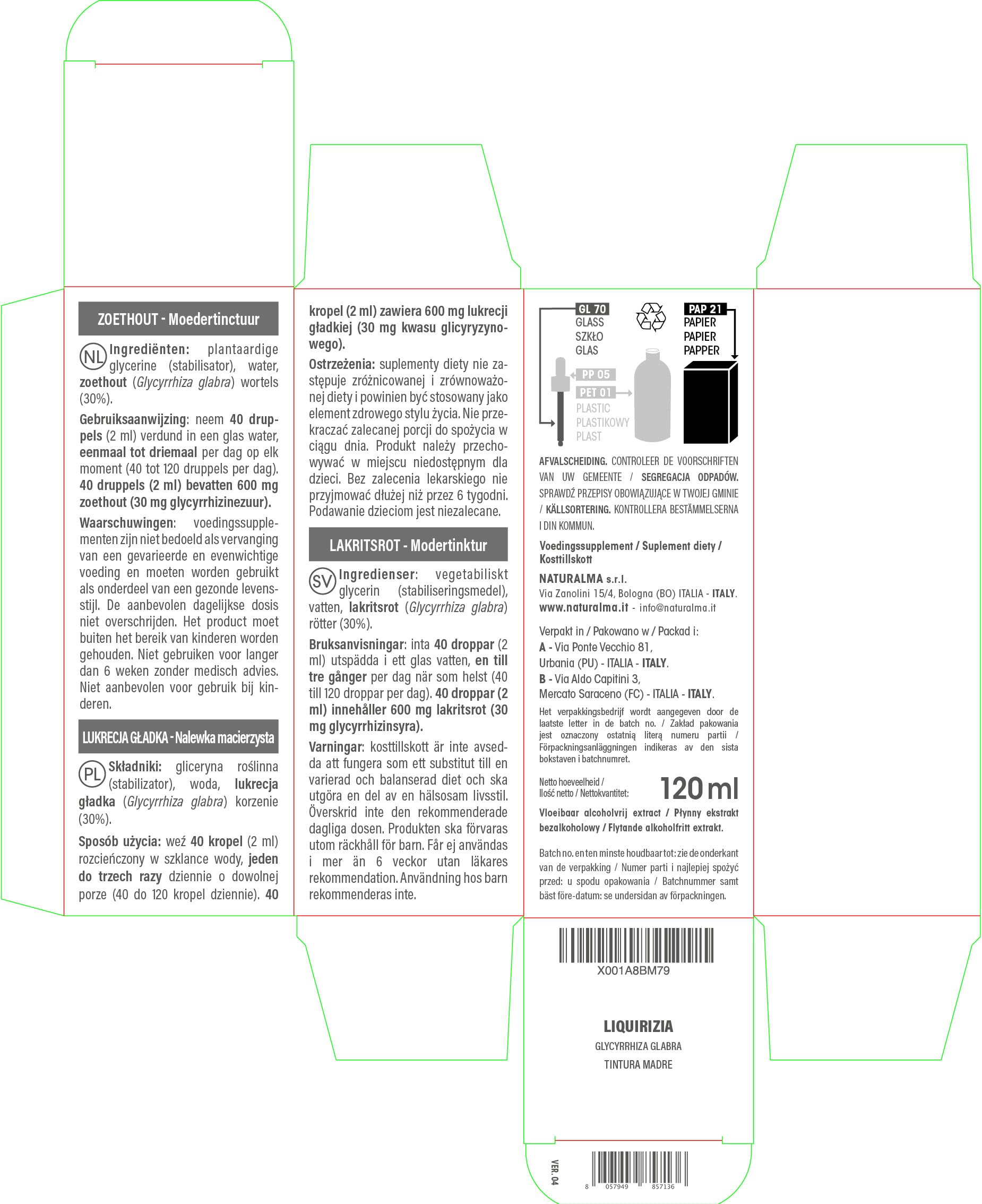 Liquorice or Licorice (Glycyrrhiza glabra) roots Alcohol-free Mother Tincture Naturalma - Liquid extract drops 120 ml - Food supplement - Vegan