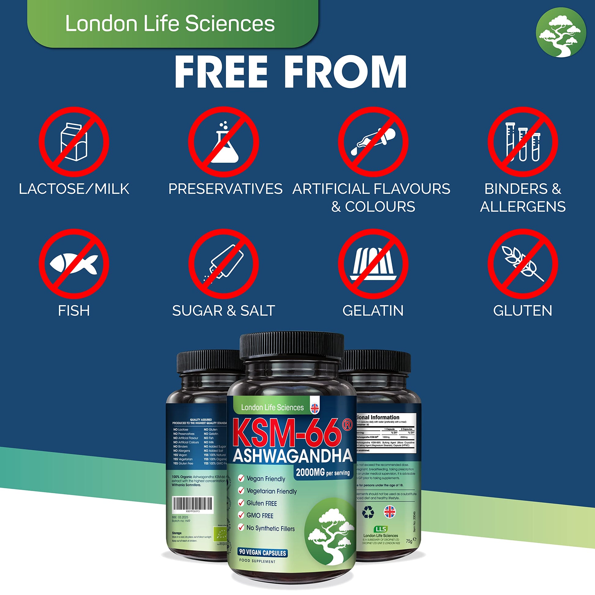 LONDON LIFE SCIENCES London Life Sciences® Organic Vegan Ashwagandha KSM-66® 90 Capsules - (Highest Concentration) 2000mg Servings & 5% Withanolides - Best Bioavailability Enhanced KSM 66 + Withania Somnifera (Made in UK)