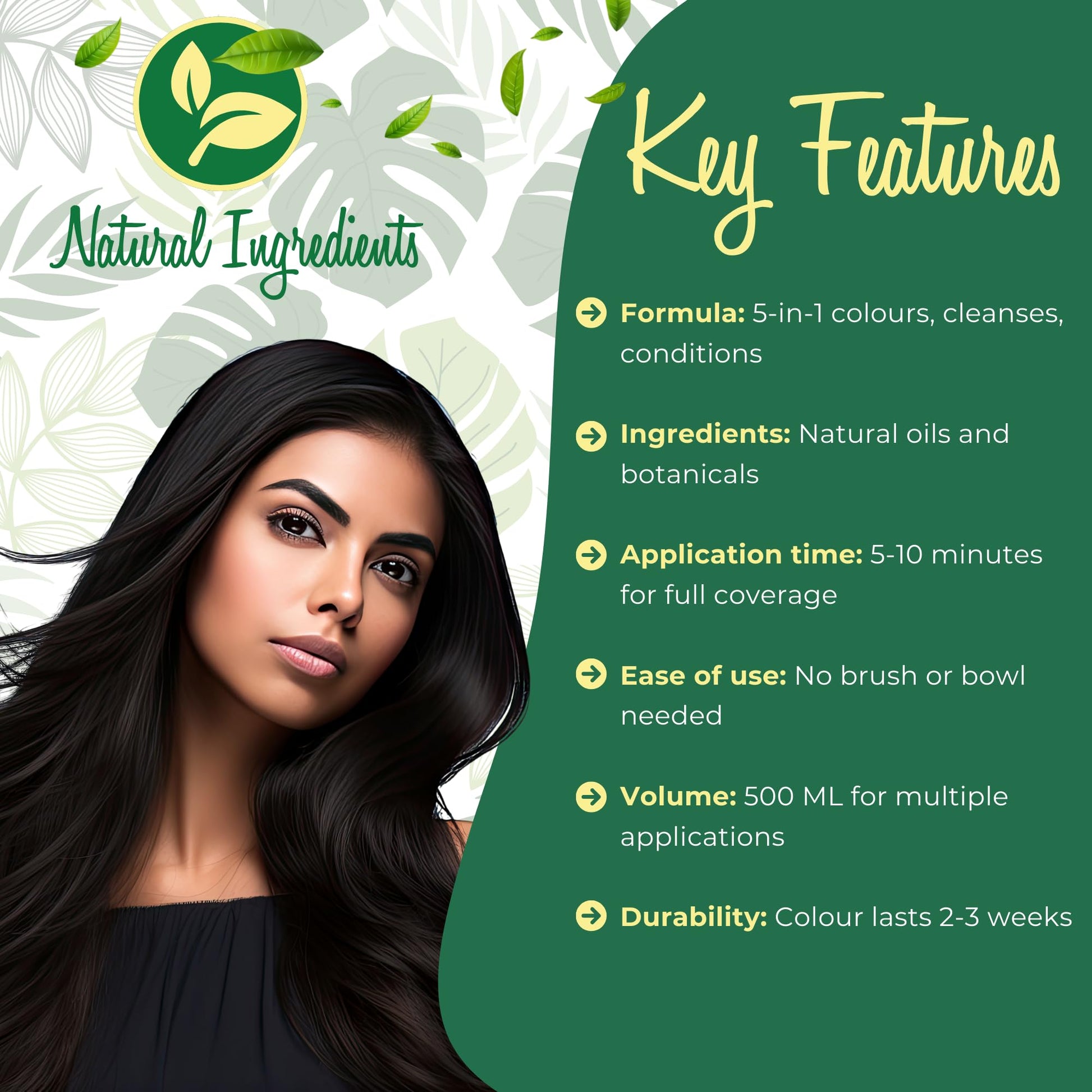 - 5-in-1 formula: colours, shines, moisturises, repairs, and reduces hair fall