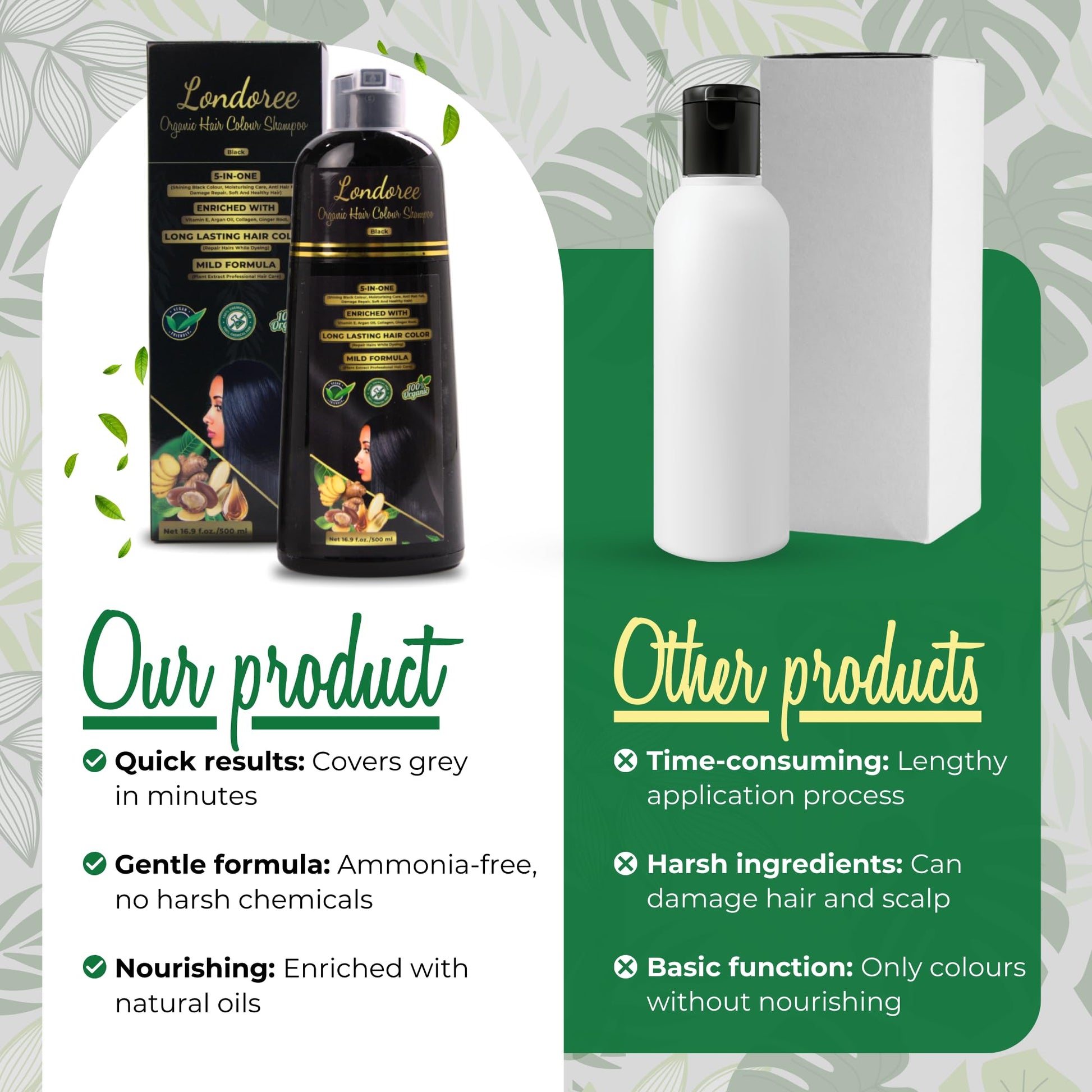This 5-in-1 hair colour shampoo is designed to make covering gray hair quick, effective, and gentle. It combines hair colouring, shine enhancement, moisturising care, damage repair, and anti-hair fall benefits in one easy step. The gentle hair darkening shampoo uses natural ingredients like Vitamin E, Argan Oil, Collagen, and Ginger Root to deeply nourish and protect hair while adding vibrant colour and shine, leaving it soft, smooth, and healthy.The ammonia-free formula is ideal for those seeking a hassle-free solution to gray hair. Application is straightforward: just wear disposable gloves, mix the no ammonia hair dye shampoo in your palms, and apply to dry hair for 15–20 minutes. Rinse thoroughly for consistent, even colour without mess or skin staining. Available in Black, Chestnut Brown, and Dark Brown, this grey hair shampoo offers an eco-friendly alternative to traditional hair dyes.