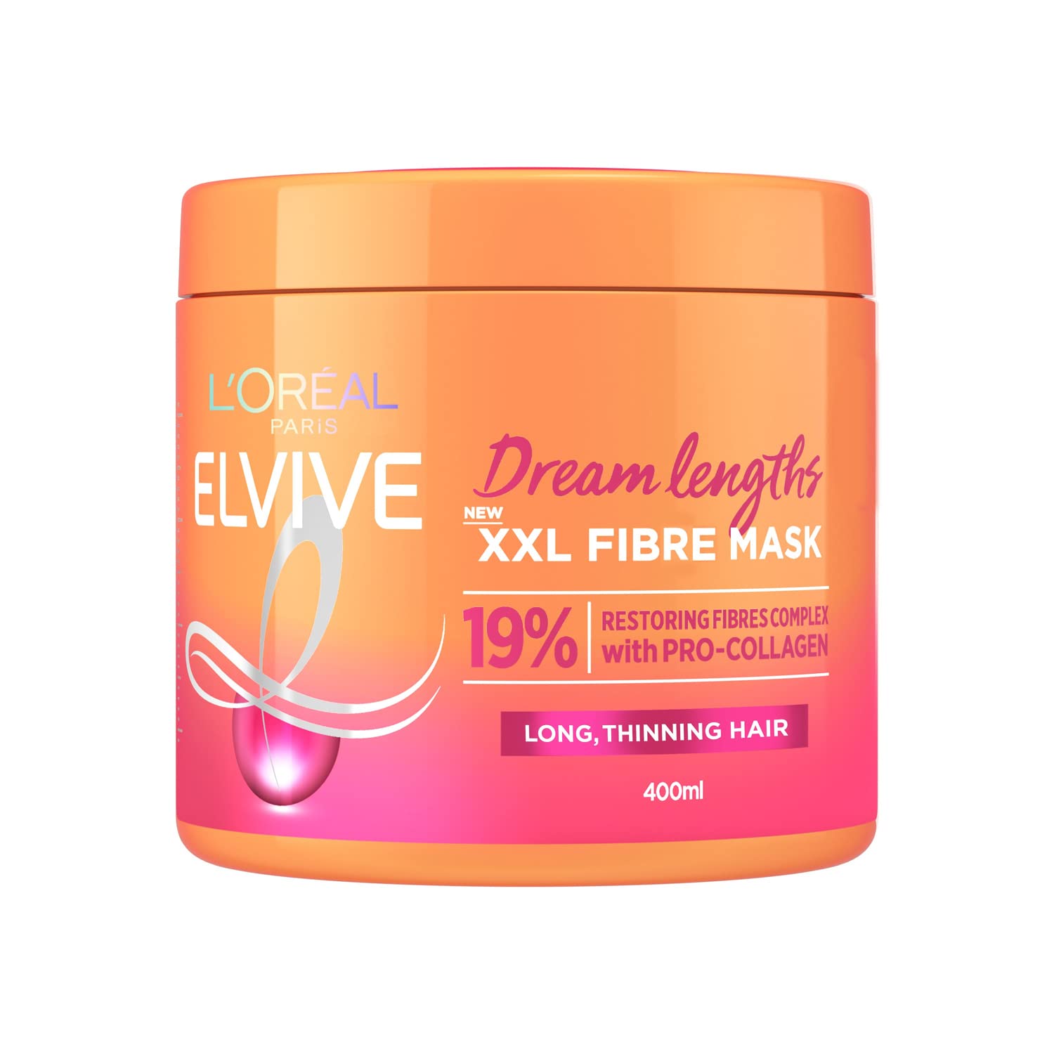 L'Oréal Paris Elvive XXL Fibre Mask for Long, Damaged, Thinning Hair, Restorative Treatment with Pro-Collagen, Dream Lengths, 400 ml