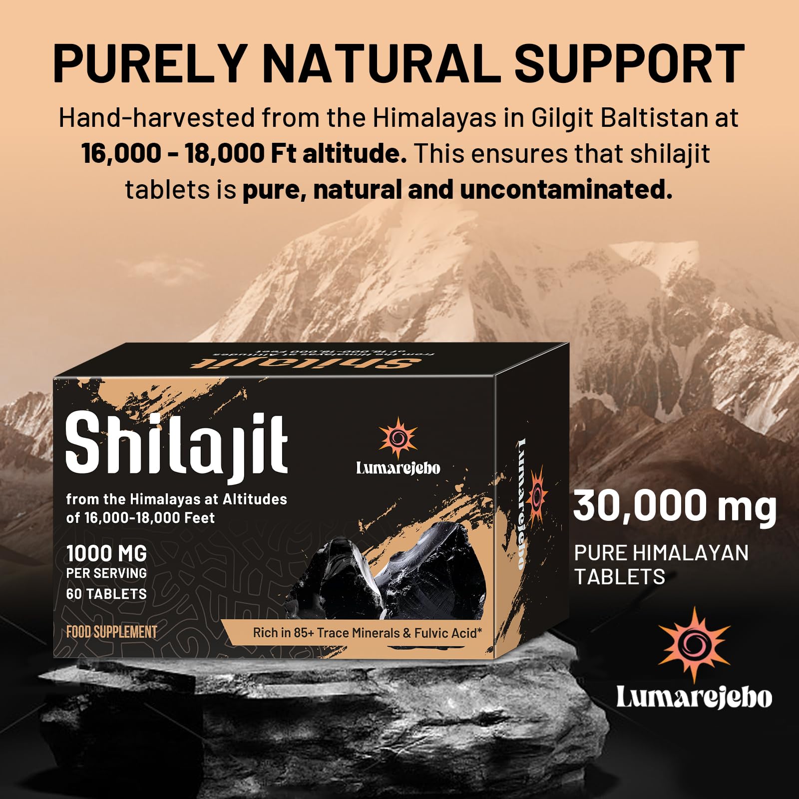 Lumarejebo Shilajit Tablets 30,000mg, 100% Pure Himalayan Shilajit Tablets (1000mg Per Serving), Rich in 85+ Trace Minerals & 60% Fulvic Acid, for Energy and Immune Support (120 Tablets)