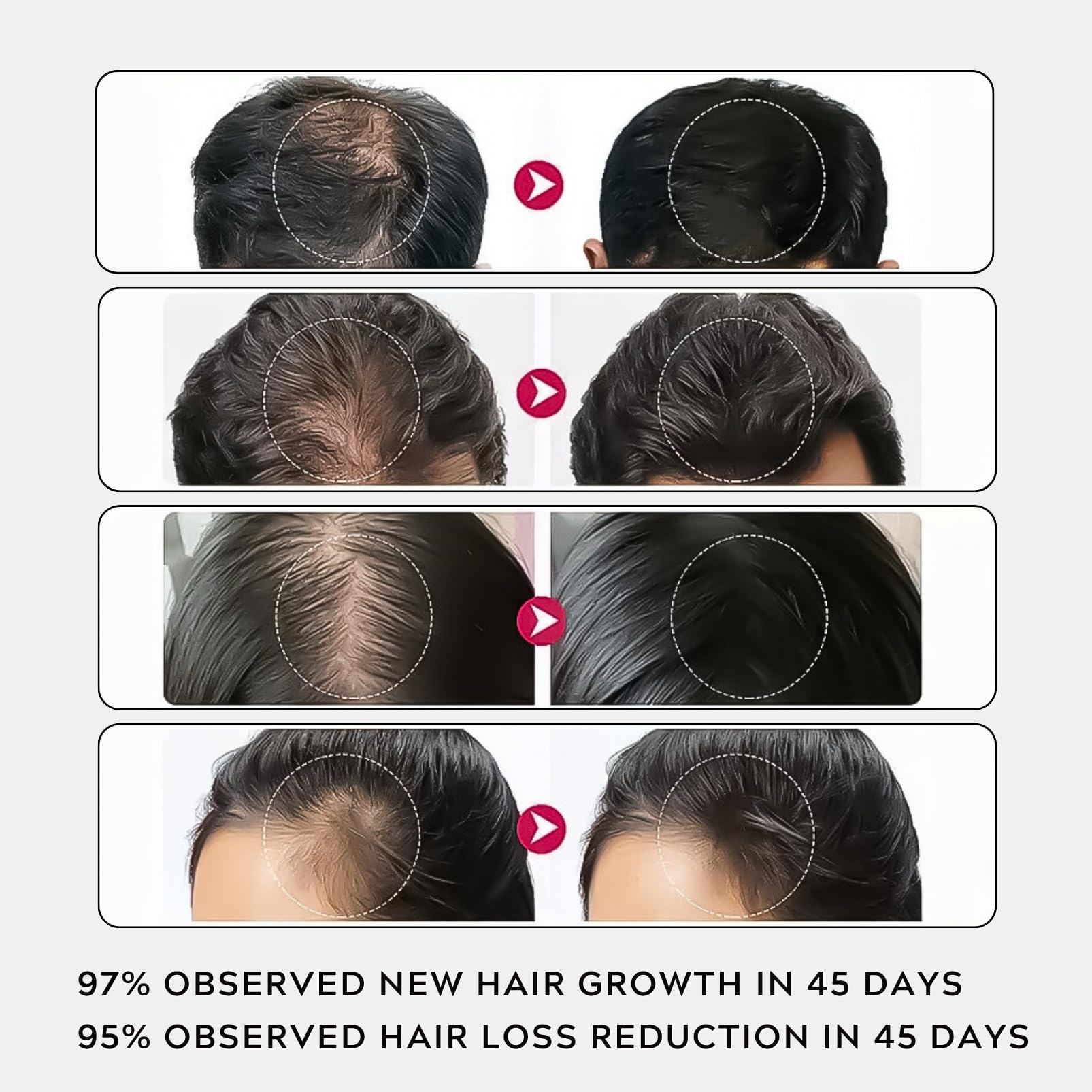 Q: How long does it take to see results with Advanced Hair Growth Serum?A: Most users notice reduced hair shedding in 4 weeks and visible new hair growth in 45 days with regular use.
