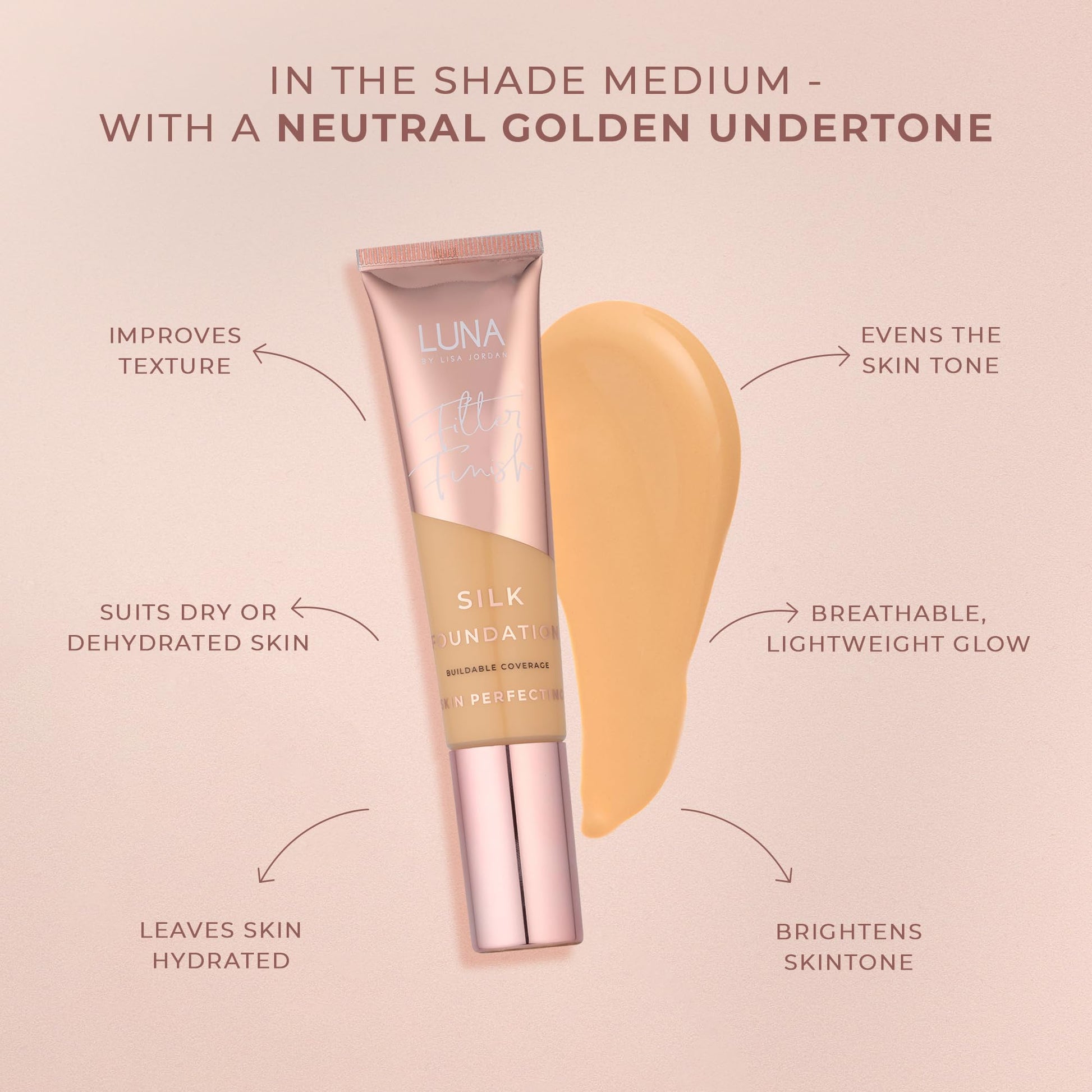 - INDULGENT TREAT FOR YOUR SKIN - Treat yourself or someone special to the gift of luxurious makeup that cares for the skin. It's the ultimate foundation for those seeking both beauty and skincare benefits. Discover the beauty of healthy, hydrated skin with LUNA Silk Foundation in Medium Shade.
