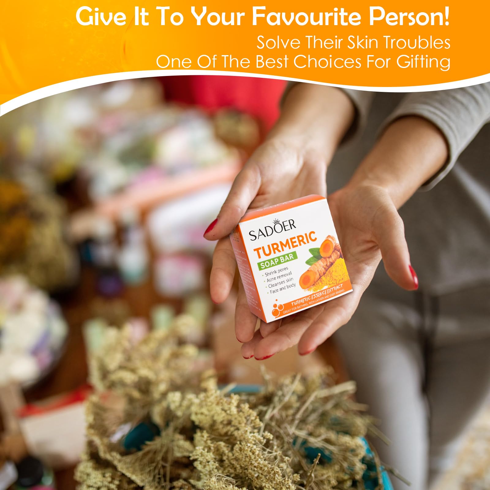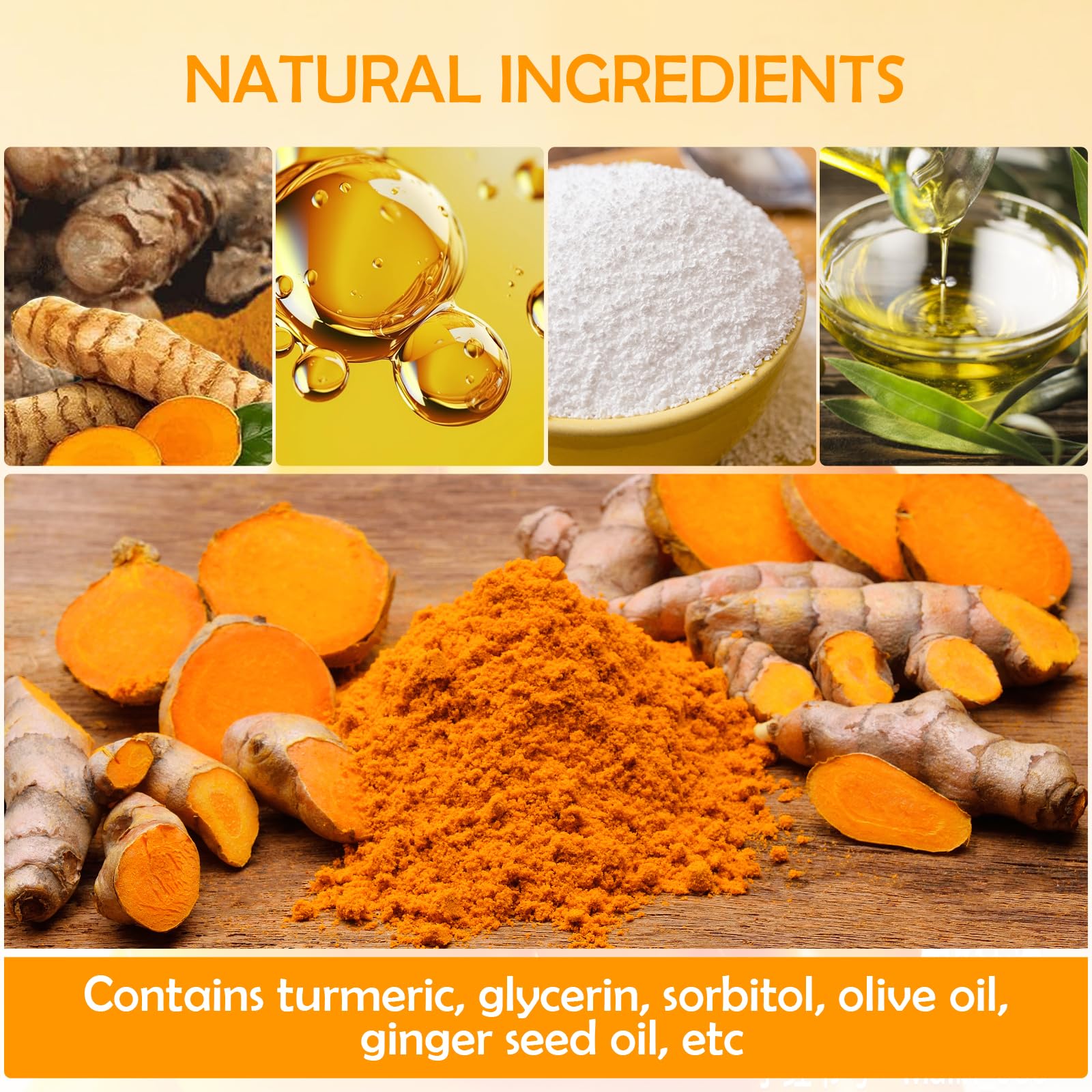 To fortify its cleansing capabilities, our turmeric soap is imbued with the invigorating essence of coconut oil, renowned for its properties. Say goodbye to acne woes as this dynamic duo of ingredients works synergistically to combat breakouts and promote a clear, blemish-free canvas. TURMERIC effect NATURAL FORMULA & NON-IRRITATING - GENTLE ENOUGH FOR ALL SKIN TYPE Main ingredients: natural ginger essential oil extract, olive oil, glycerin 3 Product Features 1.It has skin repairing and moisturizing properties, even skin tone and improve pigmentation. 2.this Turmeric soap has ingredients with nourishing Turmeric powder and Coconut oil,which will keep your skin moisturized and and restores elasticity. 3.Even skin tone: powerful natural ingredients can improve skin dullness. before and after Specifications: Package included: 1* Turmeric Soap 1* Soap Foaming Net with Drawstring Efficacy: Moisturizing, improving skin tone, repairing dark spots and uneven skin tone Applicable skin: general Net Weight: 100g Shelf life: 3 years HOW TO USE TURMERIC SOAP ? how to use Cautions For external use only. Avoid contact with eyes and inhalation. Keep away from children. Store in a cool place and avoid direct sunlight.Specifications. soap turmeric bar acid face dark cleansing honey spot black body brightening pads remover skin bars natural handmade kojie oil acne african glow hyperpigmentation lemon lightening organic original pure tumeric vegan wash care citrus cleanser creme dry extract fair friendly gentle hydrating plant scrub smooth soa sop spots spring stuff superMore Info