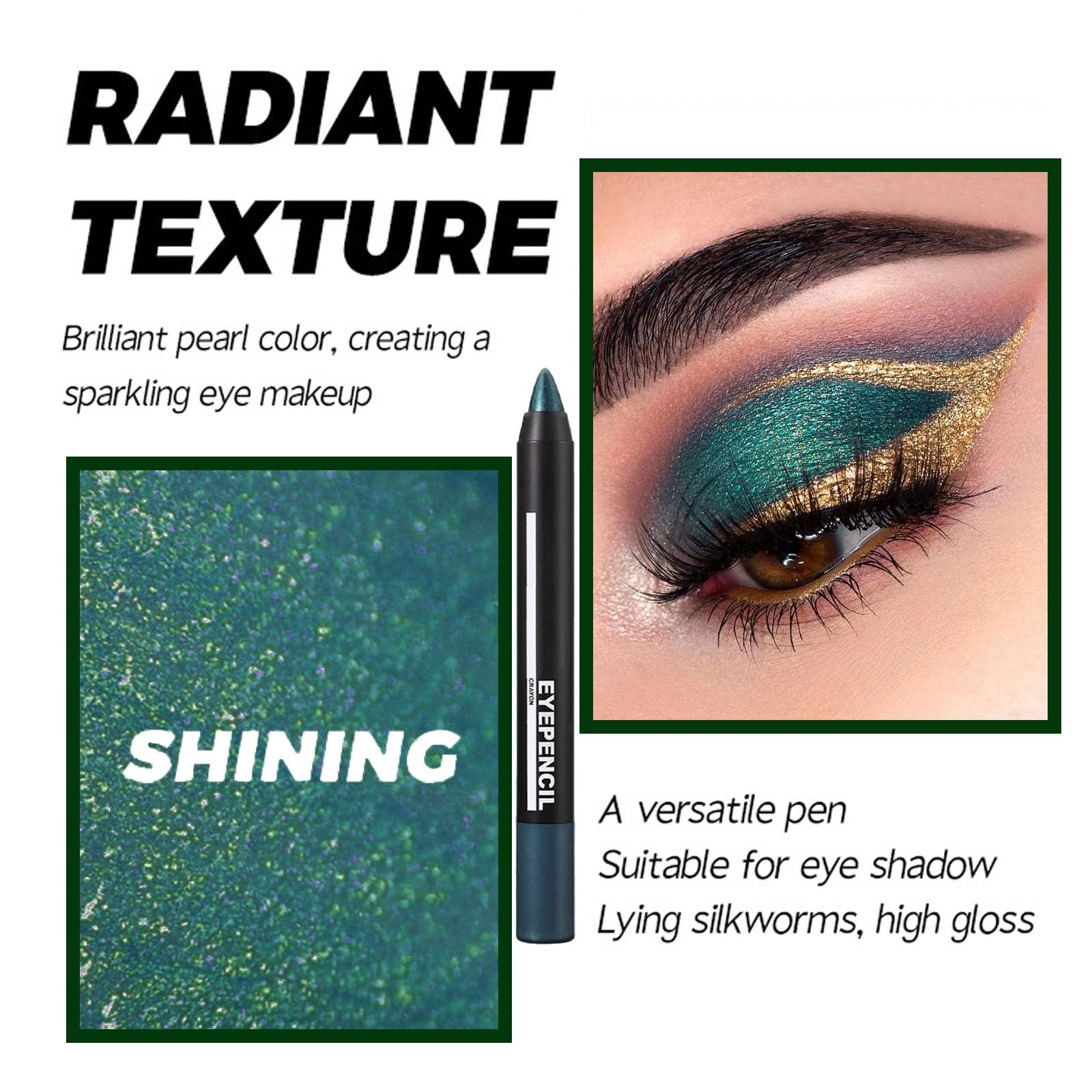 Pearlescent Eyeshadow Pencil - Our jungle green eyeshadow stick has a vibrant, shimmering color that will not only brighten your eyelids but also give them a dazzling metallic glow, making you look fabulous from every angle!Save Your Makeup Time - The convenient size of the sticks makes them easy to handle and apply. It goes on smoothly like silk, without clumping, skipping, or smudging. This eyeshadow crayon is designed for soft and quick application, providing long-lasting color without irritating the eye rim.