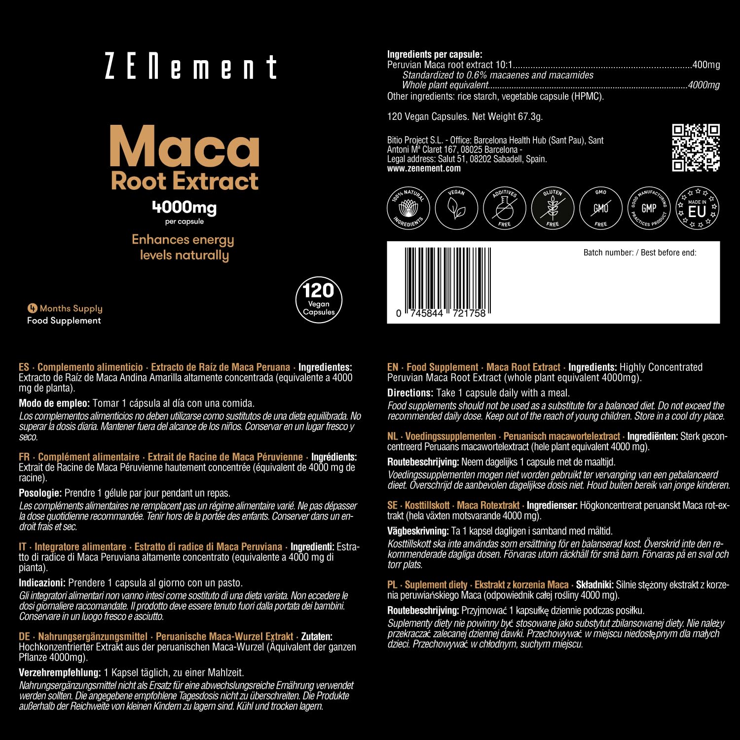 Maca Root Capsules 4000mg, High Strength Peruvian Yellow Maca Root for Men and Women | 120 Vegan Capsules (4 Months Supply) | Zenement