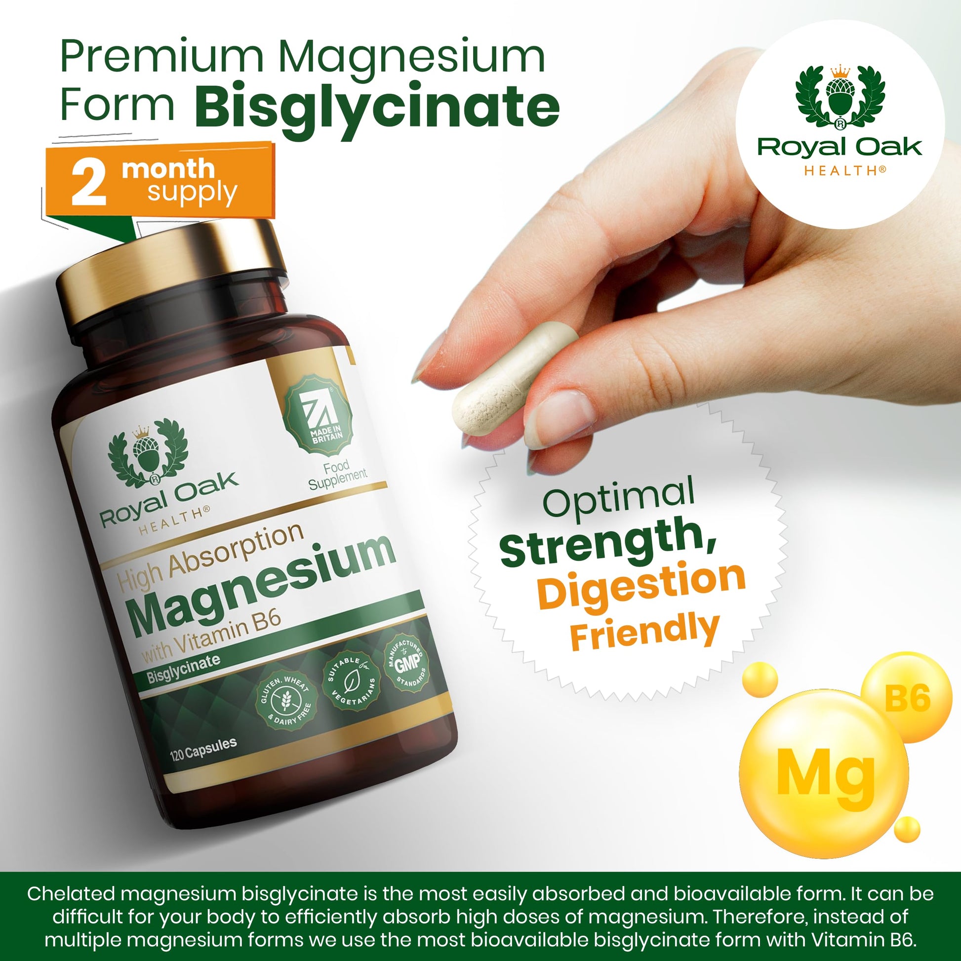 Magnesium Bisglycinate with Vitamin B6 x120 Capsules | Advanced Chelated Formula for Optimal Absorption Providing 200mg of High Strength Elemental Magnesium. Vegan & UK Made by Royal Oak HealthMore Info
