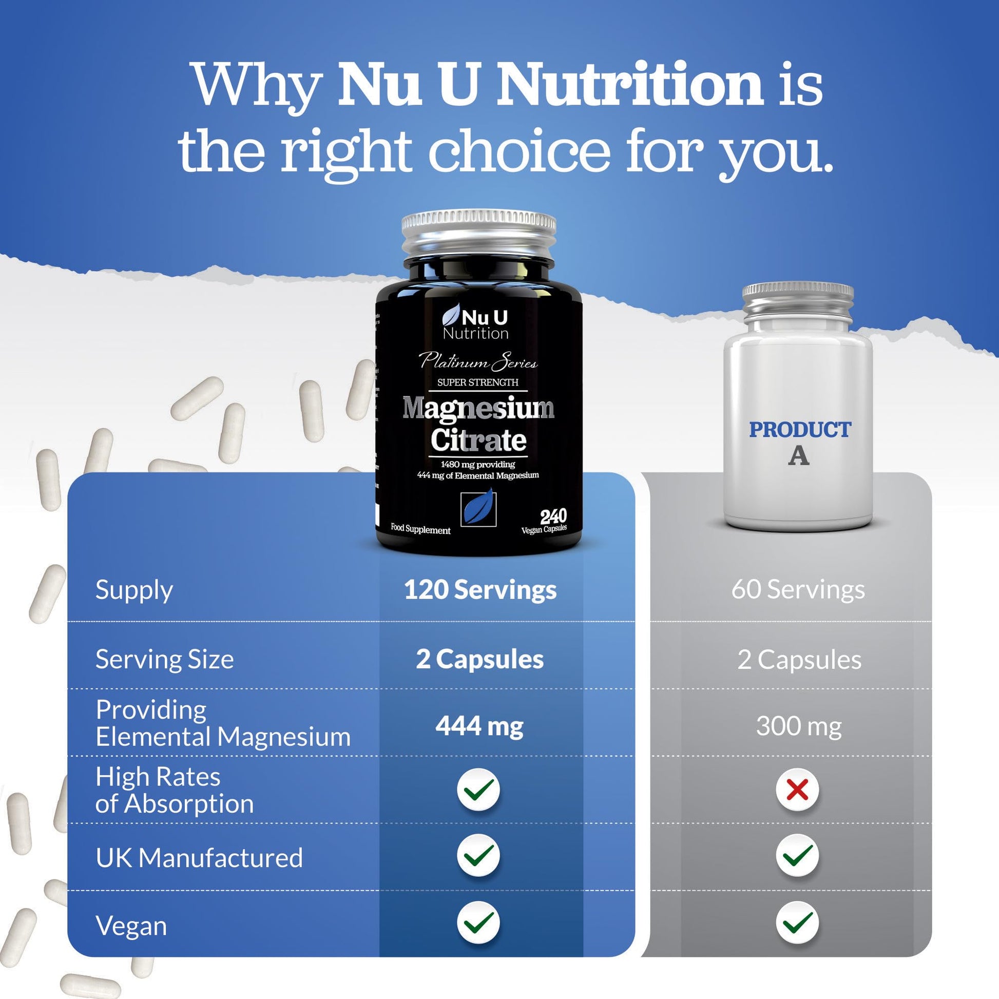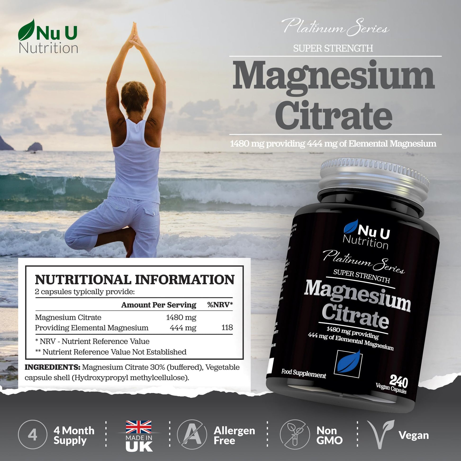 Why Take Magnesium?Magnesium is often dubbed ‘the mighty mineral’ by scientists and nutritionists as is plays a key role in so many functions required by our bodies. As substantiated by the European Food Safety Authority, magnesium contributes to:a reduction of tiredness and fatigue; normal energy-yielding metabolism; normal psychological and nervous system function; the maintenance of normal bones and teeth; normal protein synthesis and muscle function; electrolyte balance; and plays a role in the process of cell division. Our high strength and highly absorbable citrate form of magnesium contains 1480mg of Magnesium Citrate per 2 capsule serving. Unlike other Magnesium supplements on the market, our Magnesium has a full strength, advanced formula, which contains 444mg of elemental magnesium which can be taken by both men and women. You can be assured you are getting you full NRV of Magnesium with each serving. Why Buy Nu U Platinum Series Magnesium Citrate? BEST VALUE - We provide 240 capsules for a 4-month supply. FREE FROM ALLERGENS & ADDITIVES - For increased peace of mind, our Magnesium Citrate vegan capsules contain no harmful additives and are free from gluten, lactose, soya, eggs, crustaceans and nuts. NO RISK - We want you to be satisfied with your purchase from us. We offer no-questions-asked on all of our products. PREMIUM QUALITY- Our manufacturing is compliant with recognised global industry practices including GMP, HACCP, ISO 9001 & Global Food Safety standards, giving you the ultimate peace of mind.More Info
