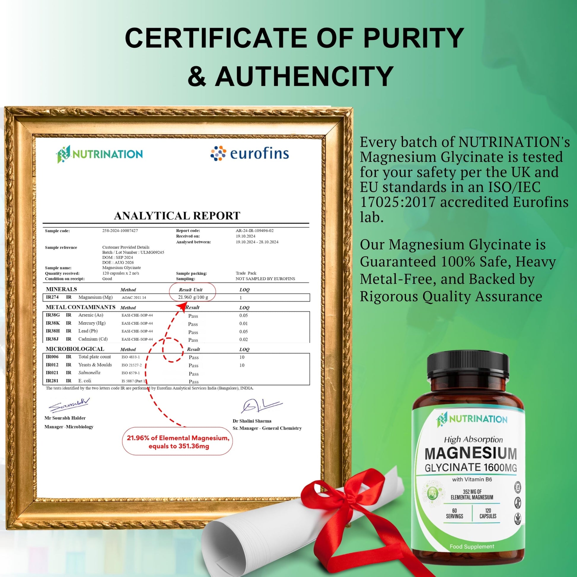Magnesium Glycinate Supplement 1600mg with Vitamin B6, 352mg of Elemental Magnesium, 94% Daily NRV, 120 High-Strength Capsules 2 Months Supply, Supports Muscle & Nerve Health, Vegan, Lab Tested