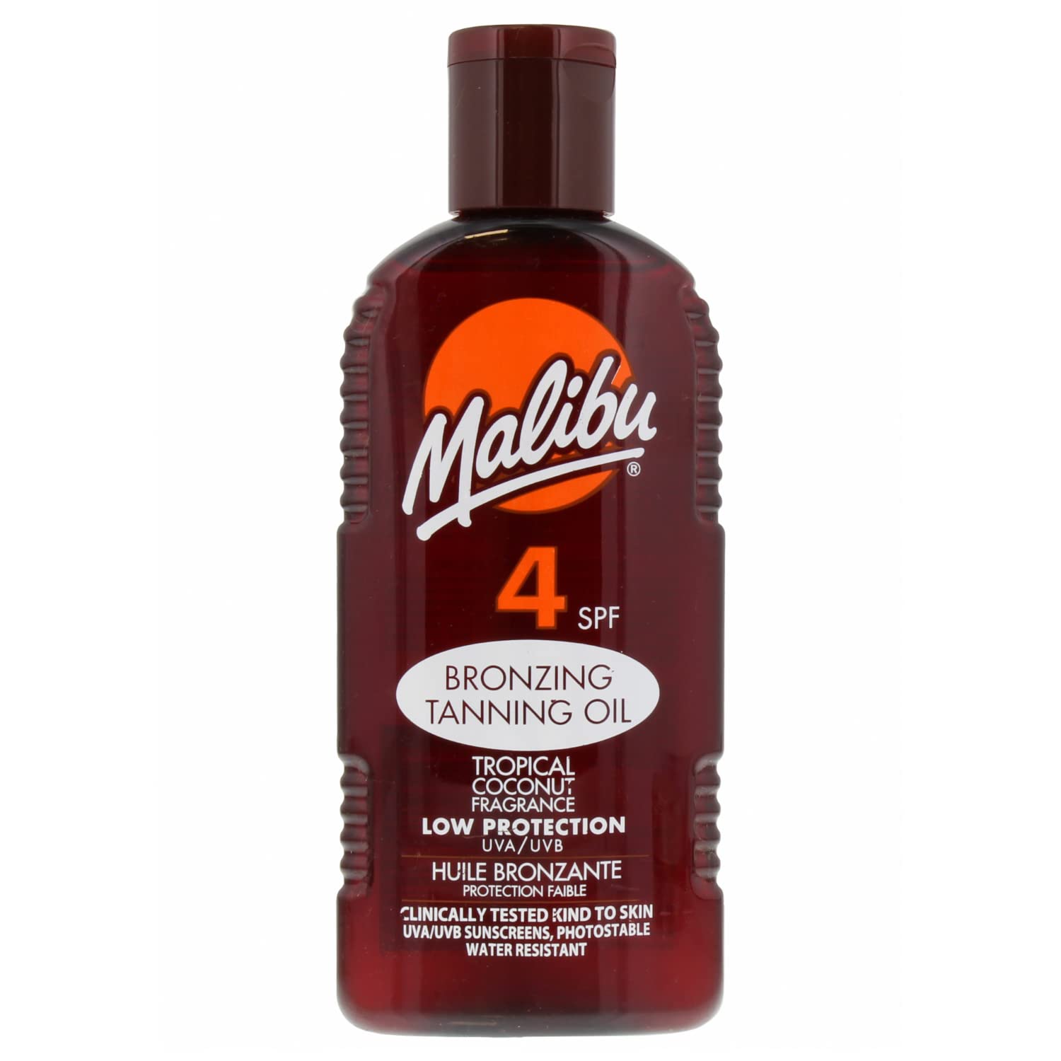 - Bronze and Protect: Build a bronzed glowing tan with Malibu tanning oil. Protect your skin against harmful and damaging UV rays with a low SP factor 4