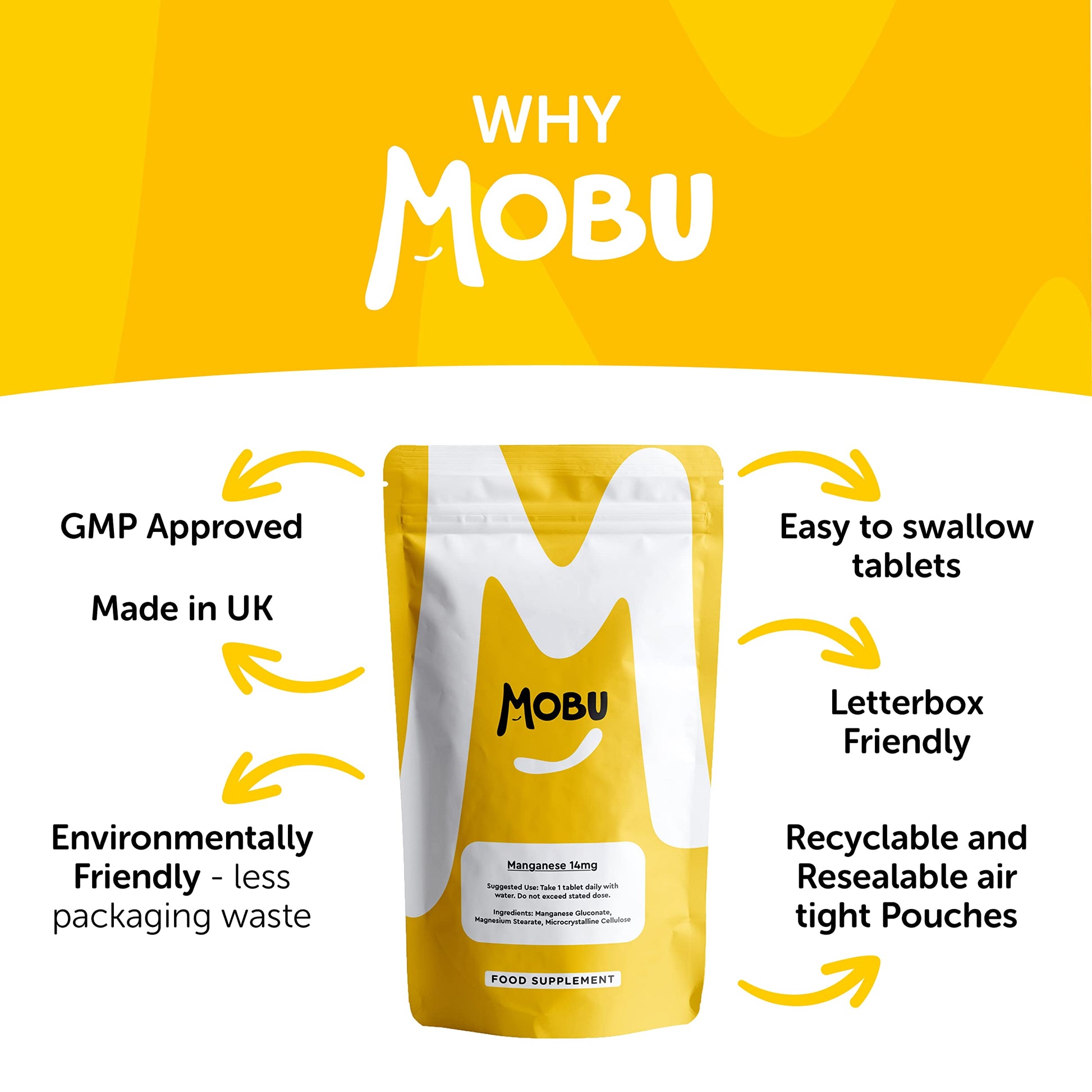 - Highest Strength - MOBU's is one of the highest strength supplements available in the UK with each tablet providing 14mg of Manganese.