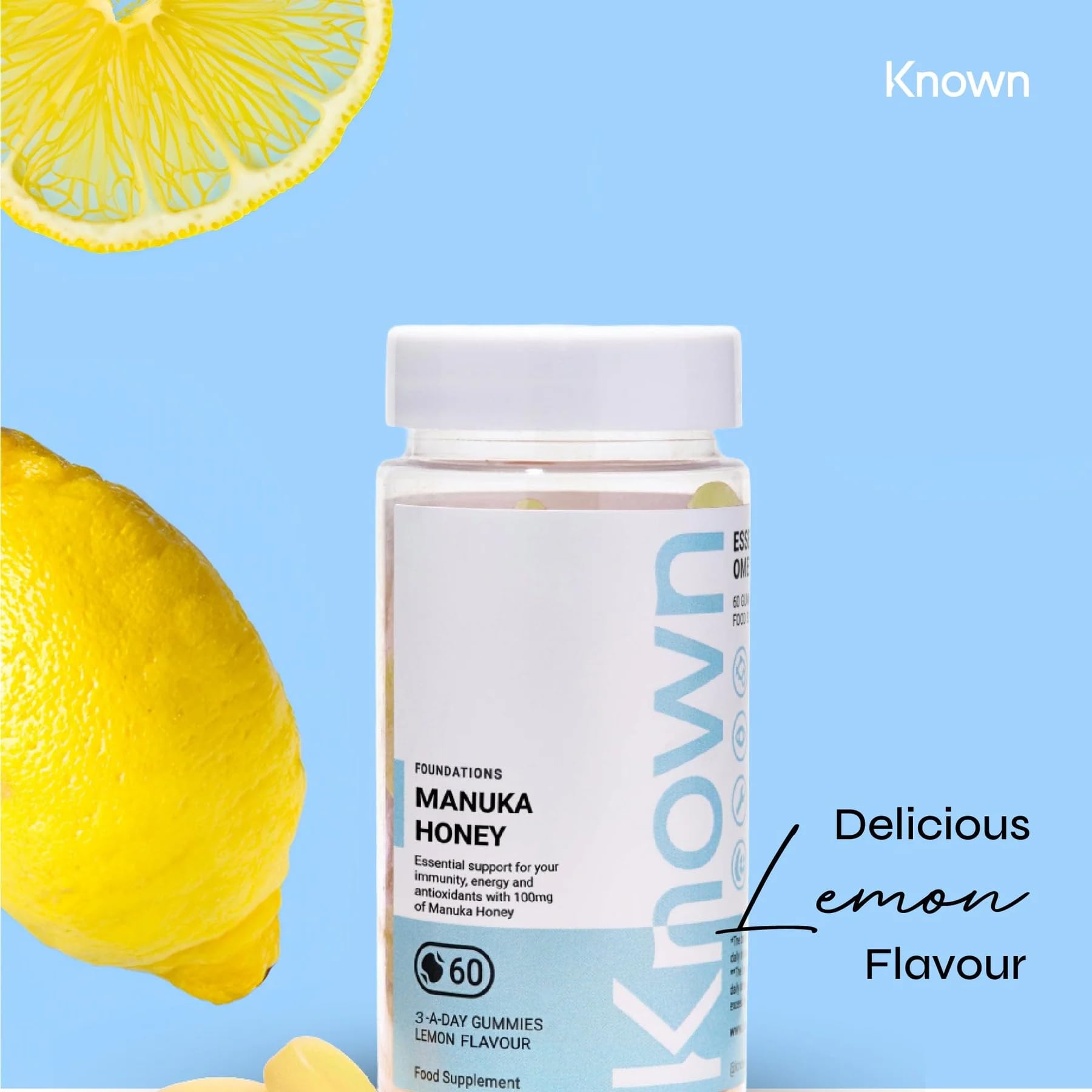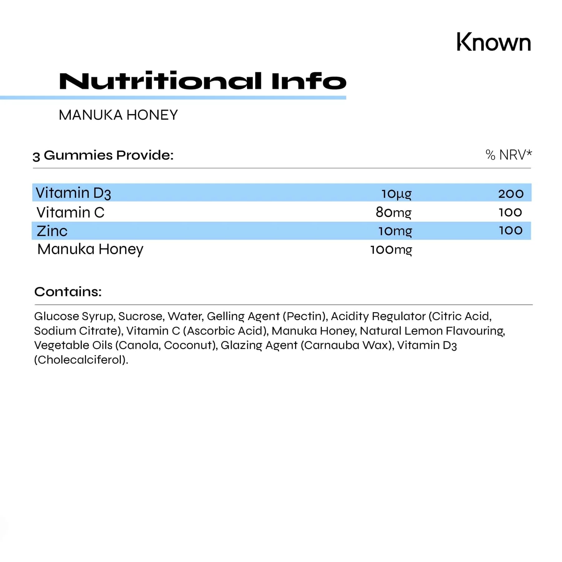 Experience the ultimate blend of taste and health with Known Nutrition’s Manuka Honey Gummies. Infused with a delightful lemon flavor, each gummy is bursting with 100mg of pure Manuka Honey per serving. Renowned for its exceptional antibacterial and antioxidant properties, our Manuka Honey MGO 125 delivers optimal digestive health support, ensuring your well-being from the inside out. Unlock the power of nature with our Manuka Honey Gummies: Indulge in the zesty taste of lemon with our gummies, free from artificial flavors or colors, making them a guilt-free treat for your taste buds. With 100mg of Manuka Honey per serving, our gummies harness the potent antibacterial and antioxidant benefits of this remarkable ingredient, promoting digestive health and providing immune support. But we didn't stop there. We've added Vitamin C, D3, and Zinc to further enhance your immune system's function, ensuring you stay resilient year-round. Vitamin C also contributes to energy-yielding metabolism, keeping you energized and ready to tackle whatever the day brings. Moreover, Vitamin C and Zinc work together to protect your cells from oxidative stress, helping you maintain overall health and vitality. Our Manuka Honey Gummies are suitable for vegetarians, ensuring that everyone can enjoy the benefits of these delicious supplements. For adults, simply take three gummies daily to experience the full spectrum of benefits. However, remember not to exceed the recommended amount. Known Nutrition is committed to providing naturally formulated health supplements that not only work but taste great too. Our Manuka Honey Gummies are meticulously crafted and rigorously tested to ensure you receive the highest quality ingredients. With Known Nutrition, you can trust that you're nourishing your body with the best. Try our Manuka Honey Gummies today and discover the difference in your well-being.More Info