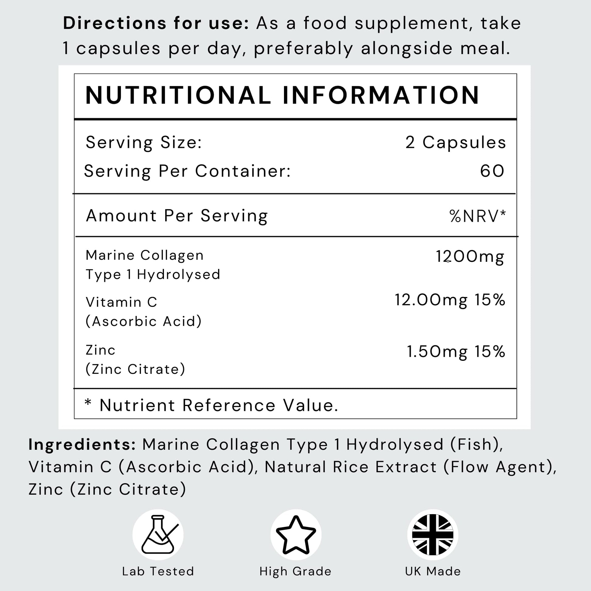 - HAIR SUPPLEMENT:- Marine collagen helps rebuild, replenish and encourage hair to grow healthier, longer and shinier. Our marine collagen capsules also contain zinc and vitamin C, both of which have been shown to have benefits for hair and scalp health. The result is a complete and highly effective skin, hair and nails supplement that is gluten free, non GMO, and made in the UK.