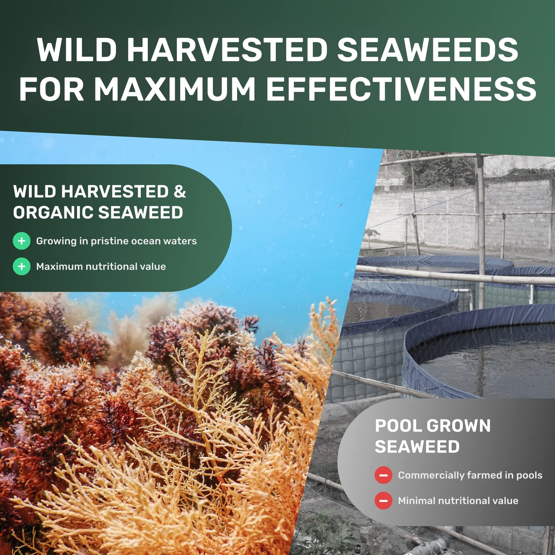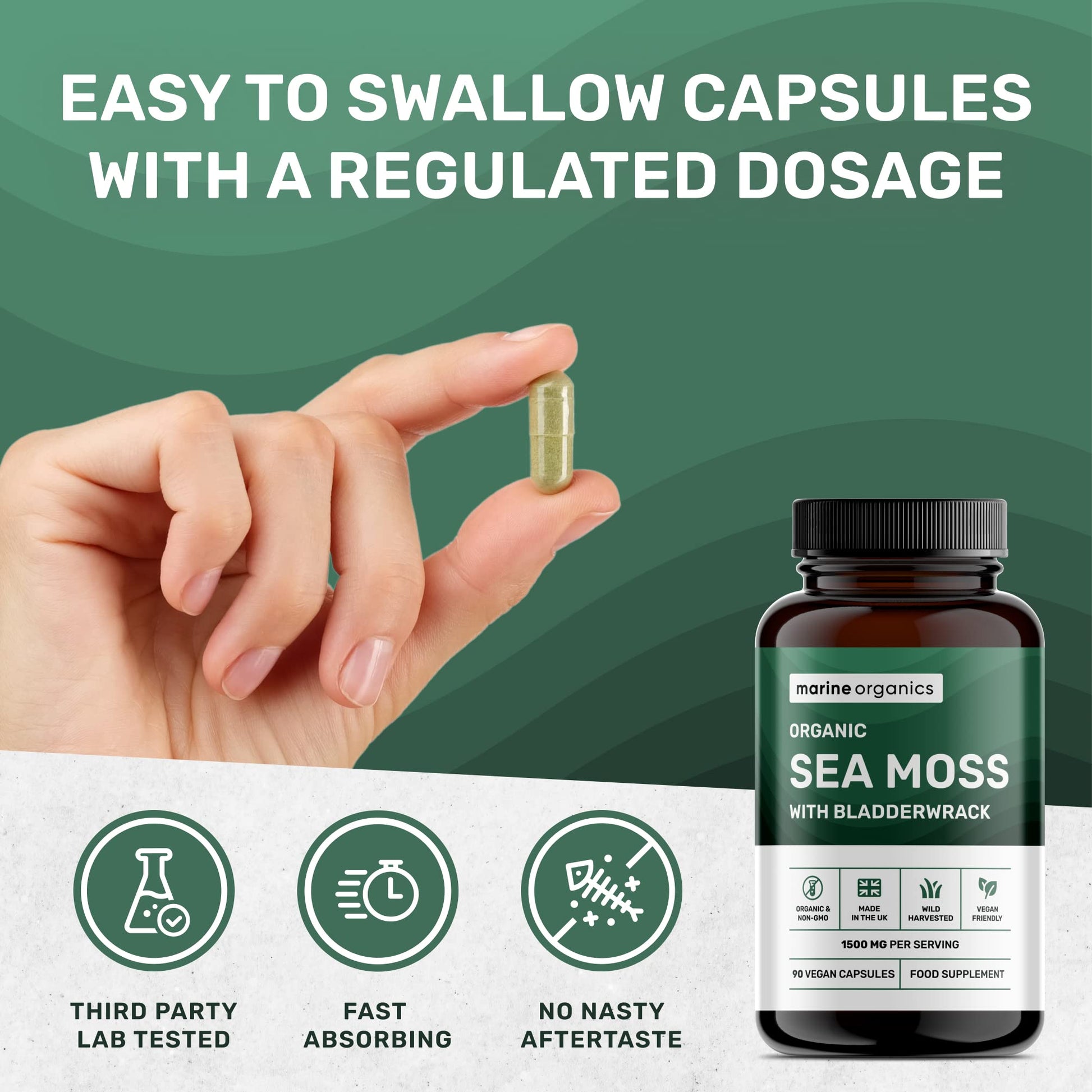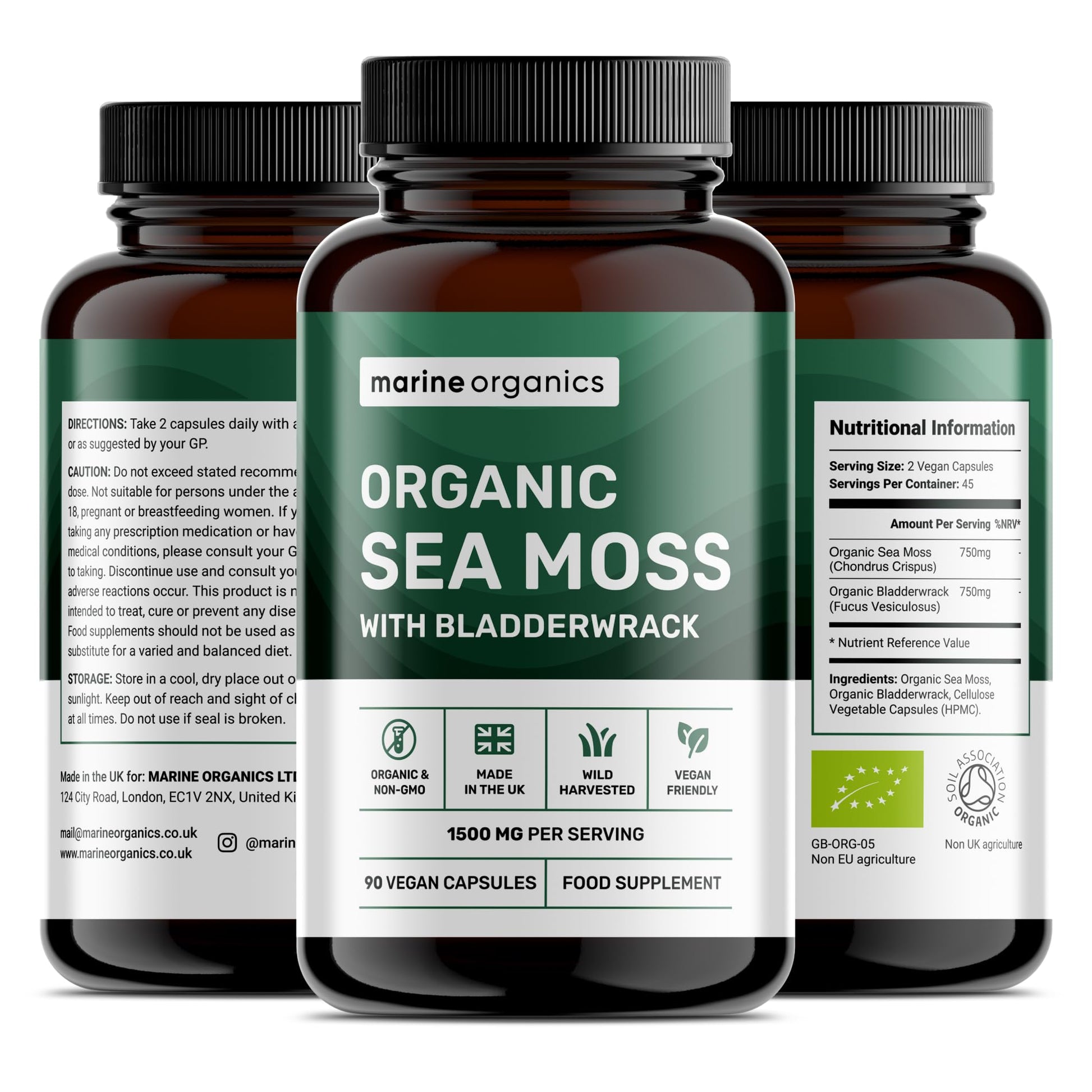 Start supporting your health today with our premium 100% organic sea moss and bladderwrack health supplement brought to you by Marine Organics. Sea moss is a nutrient-dense iodine supplement that our ancestors have used for centuries to support health and wellbeing. It’s widely regarded as nature’s most complete multivitamin, containing more than 90 of the body’s essential minerals, vitamins and micronutrients. Red seaweeds such as sea moss are also packed with antioxidants, which are compounds that help protect your cells from disease-causing oxidative damage and support your immunity, skin health, nervous system and metabolism. Like other seaweeds, such as sea kelp, sea moss is a good natural source of iodine, a micronutrient necessary for a healthy thyroid function. Iodine also contributes to normal energy-yielding metabolism, cognitive function and skin health. Unlike other iodine tablet products and raw sea moss gels or sea moss gummies, our organic sea moss capsules deliver a regulated dosage in each capsule and are easy to swallow, without leaving an unpleasant aftertaste. In comparison to brown seaweed based kelp supplements (such as sea kelp capsules, organic sea kelp tablets, organic kelp powder and other kelp herbal supplements) that are commercially farmed in pools, the ingredients for our sea moss capsules are exclusively wild harvested from areas with the highest water quality, primarily from the rocky shores across North Atlantic coastlines. Sea moss raw ingredient based supplements are a popular choice with health-conscious consumers as well as athletes who want to optimise their diet, health and performance. Get your sea moss capsules by clicking Add to Cart Now and start your journey of improved health, energy and metabolism today. Who is Marine Organics? We are a UK-based specialist health supplement brand with the mission to leverage the power of nature and the sea to create 100% organic, effective and clean supplements.More Info