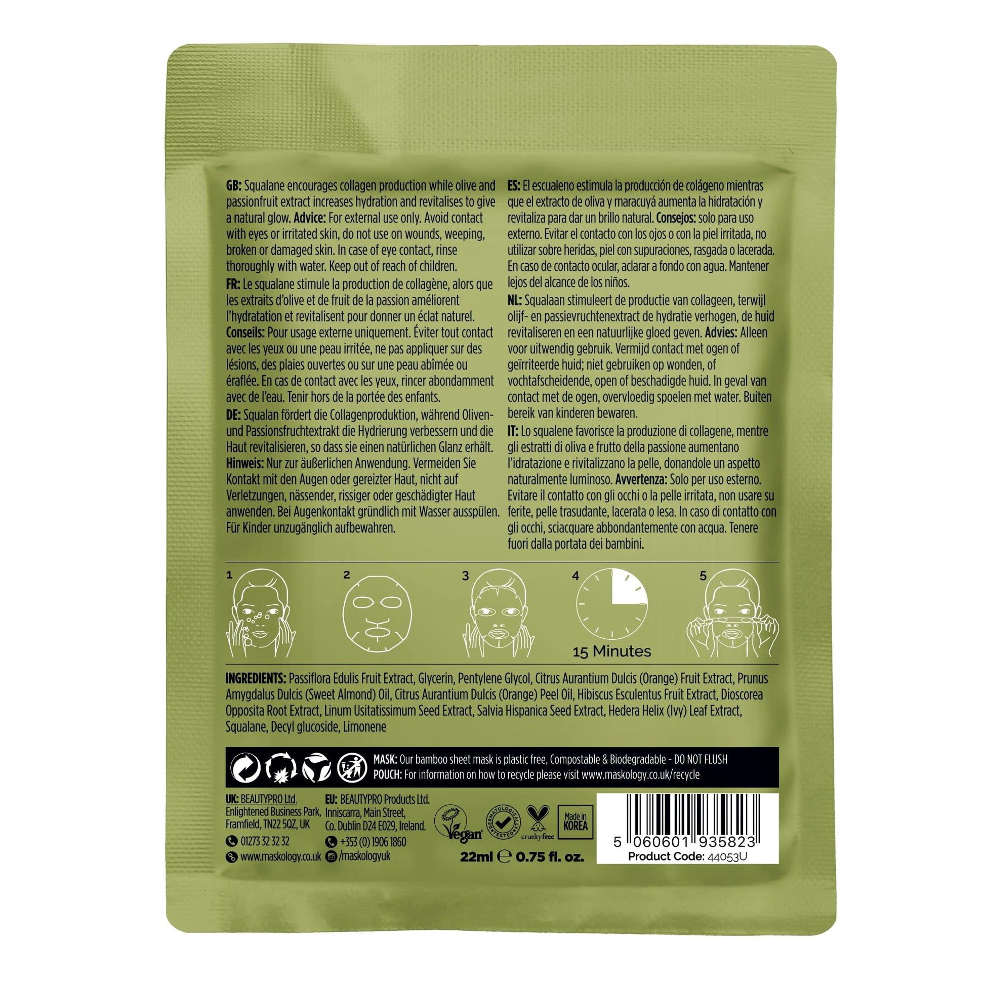 MASKOLOGY SQUALANE Professional Sheet Mask Pack of 1 | Hydrating Face Masks Skincare | Anti Aging Skin Care | Olive & Passionfruit | 100% Plant Based |