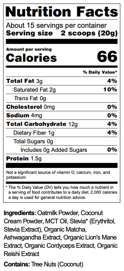2,000mg of organic ceremonial grade matcha, 500mg organic lion's mane, 500mg organic cordyceps, 500mg organic reishi, 500mg ksm-66 ashwagandha, 2,000mg pure c8 mct oil.