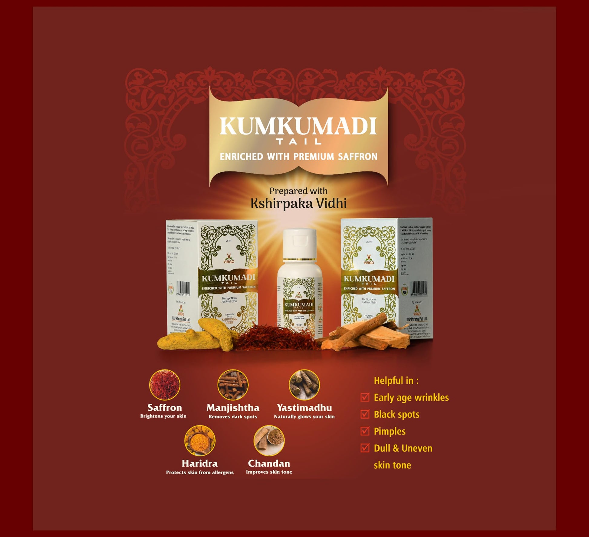 Pamper your skin with a traditional beauty regimen Ayurveda the science of life, propounds the secret of angelic beauty. Kumkumadi Tailam has been the ayurvedic recipe and an integral part of the traditional beauty regime. It contains the exotic and premium herb “Saffron” along with the rich blend of renowned Ayurvedic herbs and several other natural ingredients processed with Sesame oil and Milk, for imparting a young, healthy & radiant skin. Kumkumadi Tailam Lightens the complexion. It removes scars, wrinkles and reverses the effect of suntan, blemishes and uneven patches. Available In: 25ml Directions : Clean face, pat dry. Gently massage 10-15 drops of Kumkumadi Tailam. Allow the application to remain on face for at least 30 minutes before rinsing off. For best results, allow the application to remain overnight. If you have oily skin, avoid using the oil at night time. Ingredients Kumkumadi Tailam, Kesar, Manjistha, Yastimadu, Chandan, Haridra and other benefical herbs.More Info