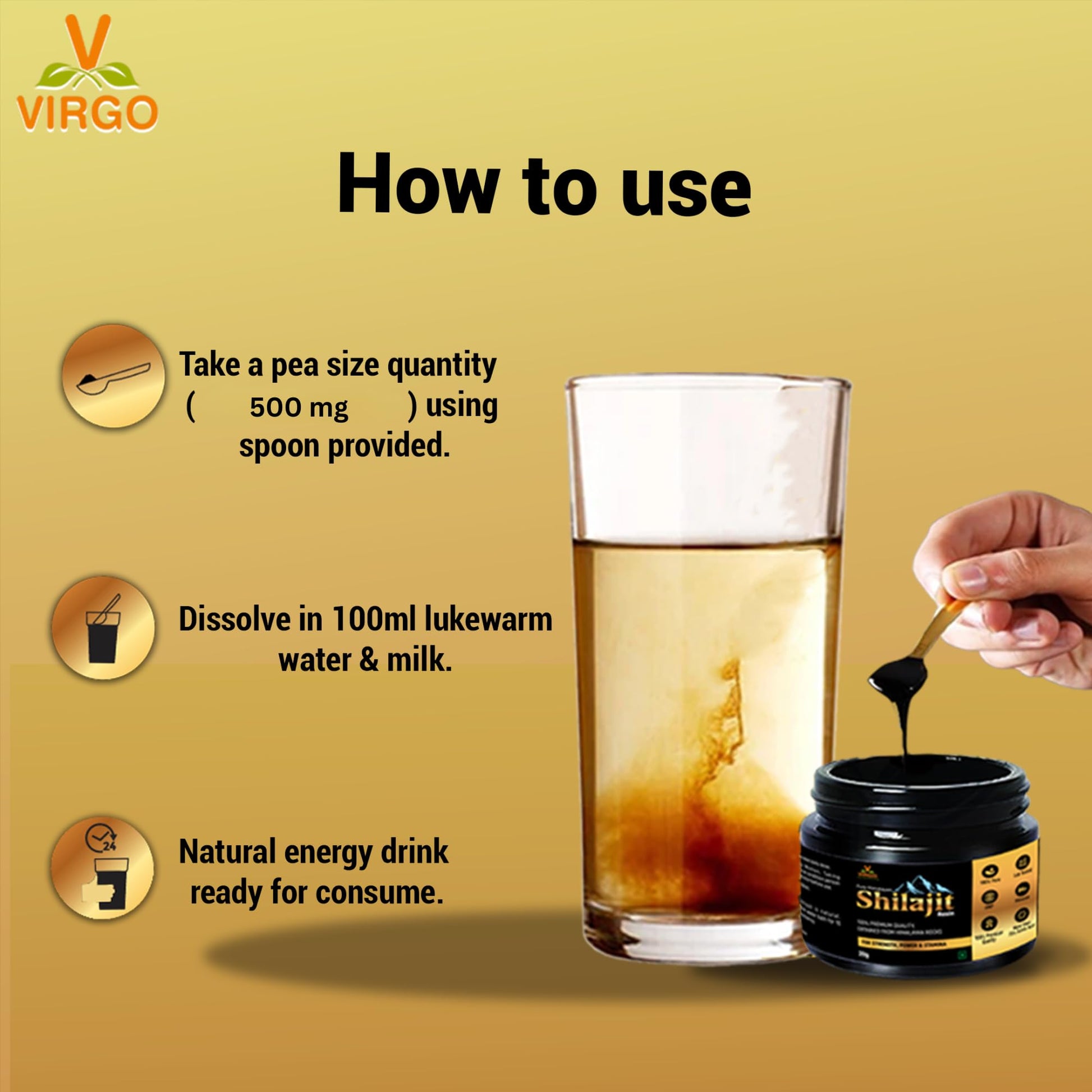 Harness the potent, natural power of Virgo Shilajit Resin and step into a world of enhanced energy and well-being. Your journey to a healthier, more vibrant life starts here. Supercharge Your Energy: With its rich fulvic acid content, Virgo Shilajit Resin helps enhance your stamina and vitality, providing a natural energy boost. Optimize Your Wellness: Known for its rejuvenating properties, Shilajit supports overall health, balancing your body’s functions and promoting a sense of well-being. Pure and Potent: Our Shilajit is 100% pure, ensuring you receive the highest quality and efficacy. Every batch is meticulously tested to meet rigorous standards. Easy to Use: Simply dissolve a small amount in warm water, milk, or your favorite beverage, and experience the transformative benefits daily. Harness the ancient wisdom of Ayurveda with Virgo Shilajit Resin and embark on a journey to better health and vitality. Your body deserves the best—embrace the power of nature today! 🌿More Info