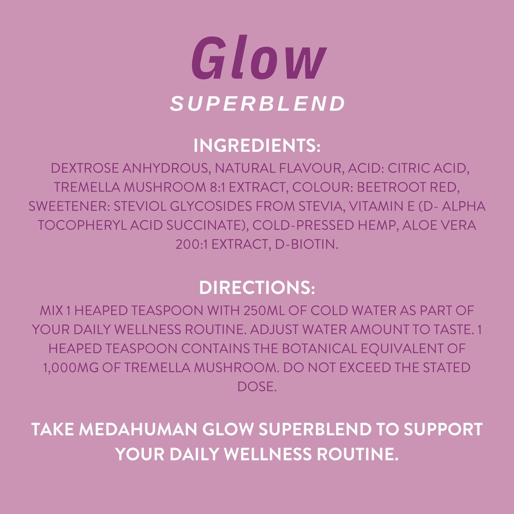 MEDAHUMAN Glow Mushroom & Adaptogen Superblend Powder, with Tremella Mushroom, Vitamin E, Biotin and Aloe Vera, to Promote Glowy Skin & Boost Collagen, Raspberry Flavour 1 x 150g