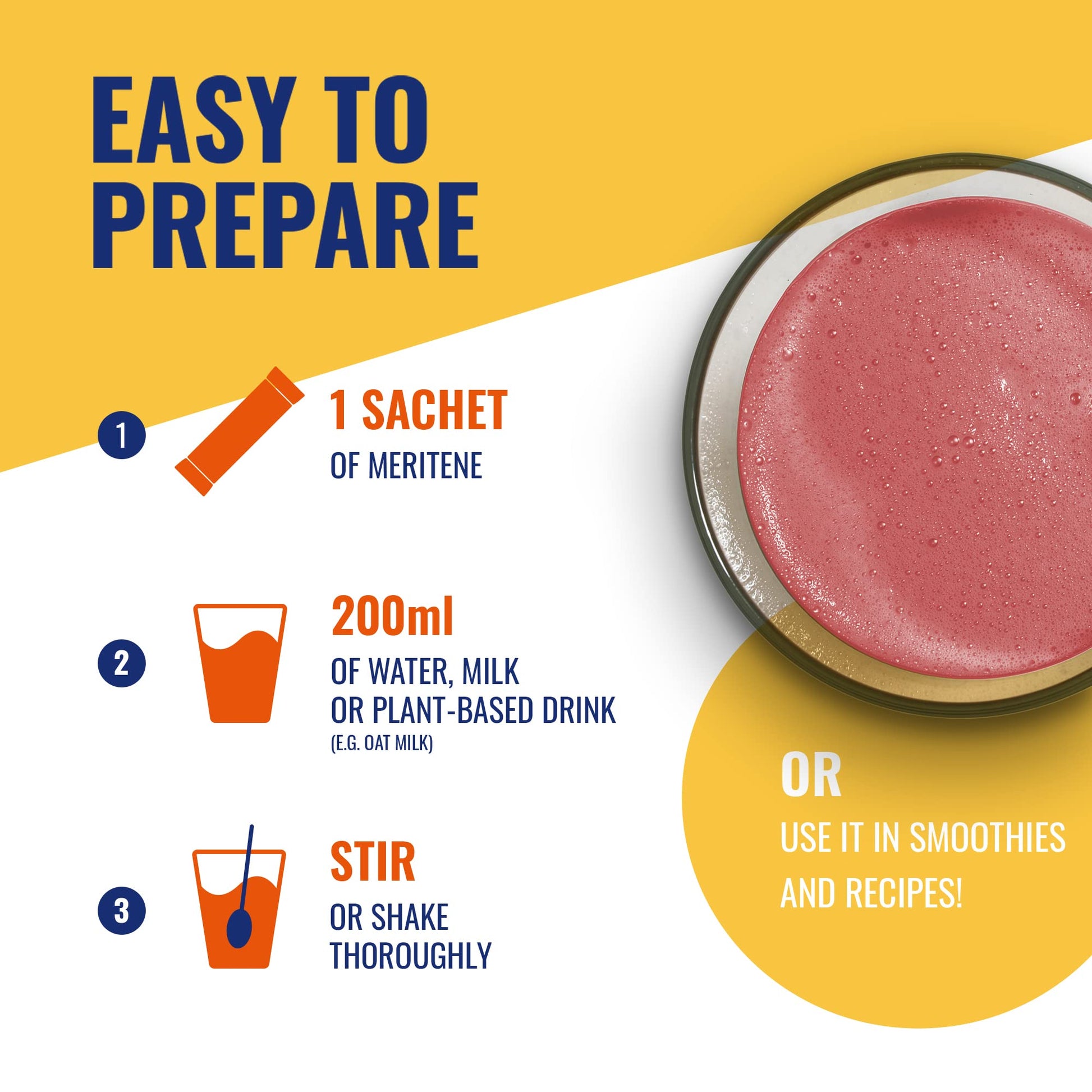 Meritene Energis Shake: Our delicious Meritene Energis Strawberry Shake sachets are designed to help when you are feeling run down, tired, or to help with recovery. Each Meritene Strawberry Shake contains protein plus 19 vitamins and minerals so you can feel your best. This Meritene Strawberry Shake 15 pack is perfect to mix with water, milk, in smoothies, or as part of a recipe, time and time again! We recommend one Meritene Strawberry Shake a day, which you can enjoy at home or even when you’re on the go.More Info