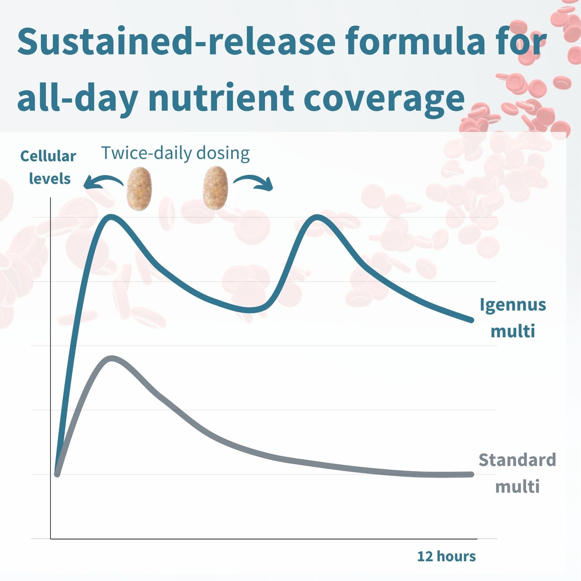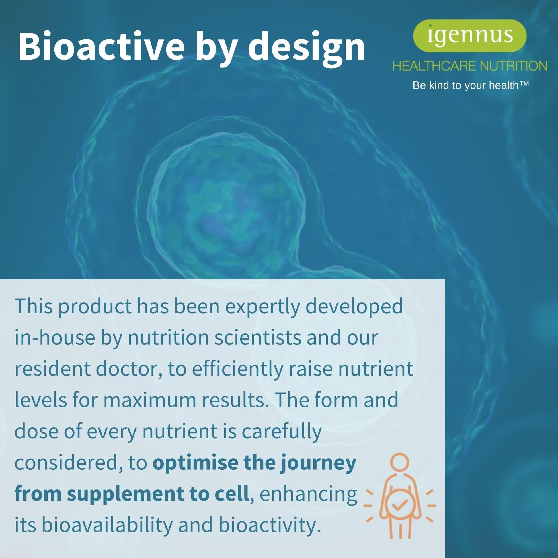 Methylated Men's Multivitamin is a high-absorption multi-nutrient supplement without iron formulated to provide comprehensive nutritional support for adult men of all ages. This vegan formula features highly bioavailable and active forms, allowing nutrient levels to be effectively raised in the body for superior benefits. Enhanced with sustained release technology and combined with twice-daily dosing, this supplement steadily releases nutrients into the bloodstream for all-day nutrient coverage. Expertly formulated by Igennus nutrition scientists with effective doses and balanced nutrient ratios, this supplement works in harmony with the body. It complements and tops up the diet, so it is safe to take long term. Designed to support overall physical and mental wellbeing, we have elevated doses of vitamin D, B6 & B12 and zinc, plus 10mg lycopene for enhanced coverage for energy and endurance, immunity, male hormonal balance, brain function and mood, muscle function, cardiovascular and prostate health.More Info