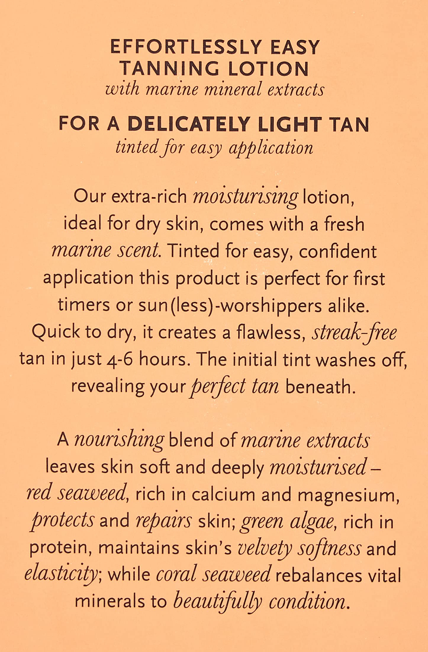 - Our extra-rich moisturising lotion is ideal for dry skin, creating a flawless, streak-free tan in just 6-8 hours. Quick to dry and tinted for easy application, this product is perfect for first timers or sun(less)-worshippers alike. The initial tint washes off, revealing your perfect tan beneath and leaving skin with a fresh marine scent.