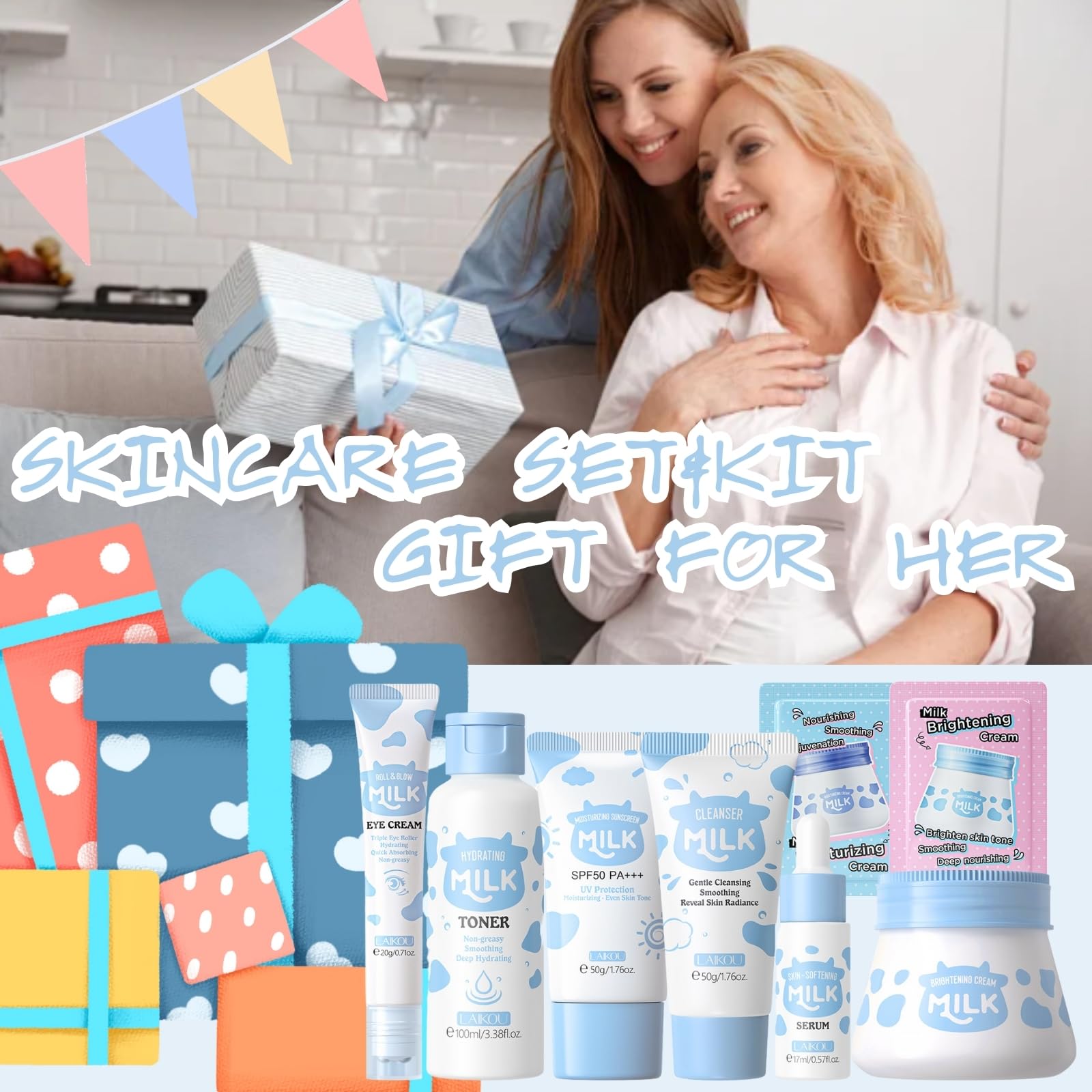 Indulge your skin with the nourishing benefits of milk with this complete milk skincare set, designed to hydrate and restore your skin’s natural radiance. This 8-piece collection offers everything you need for a comprehensive skincare routine, targeting dryness, uneven skin tone, and skin texture.