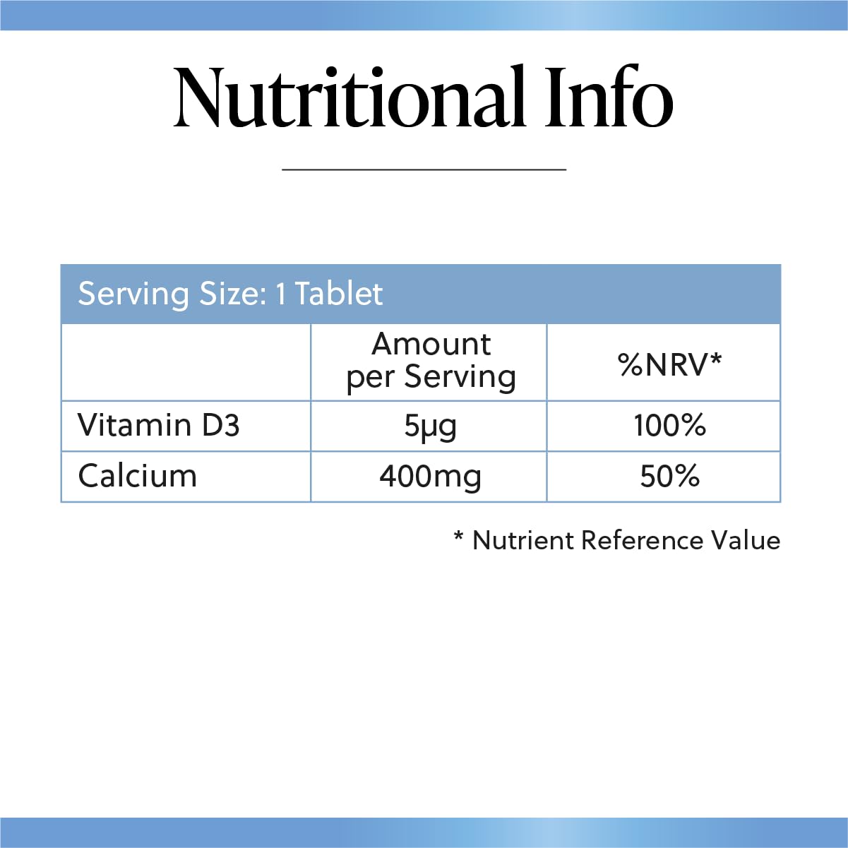 - ABOUT OUR CALCIUM + D3: A high-strength supplement designed to support your musculoskeletal health and overall wellbeing. Each tablet delivers 400mg of Calcium, vital for maintaining strong bones, muscles, and teeth, along with 5µg of Vitamin D3, which assists calcium absorption. This formula is ideal for all ages, helping you maintain the essential nutrients your body needs for a healthy, active lifestyle.