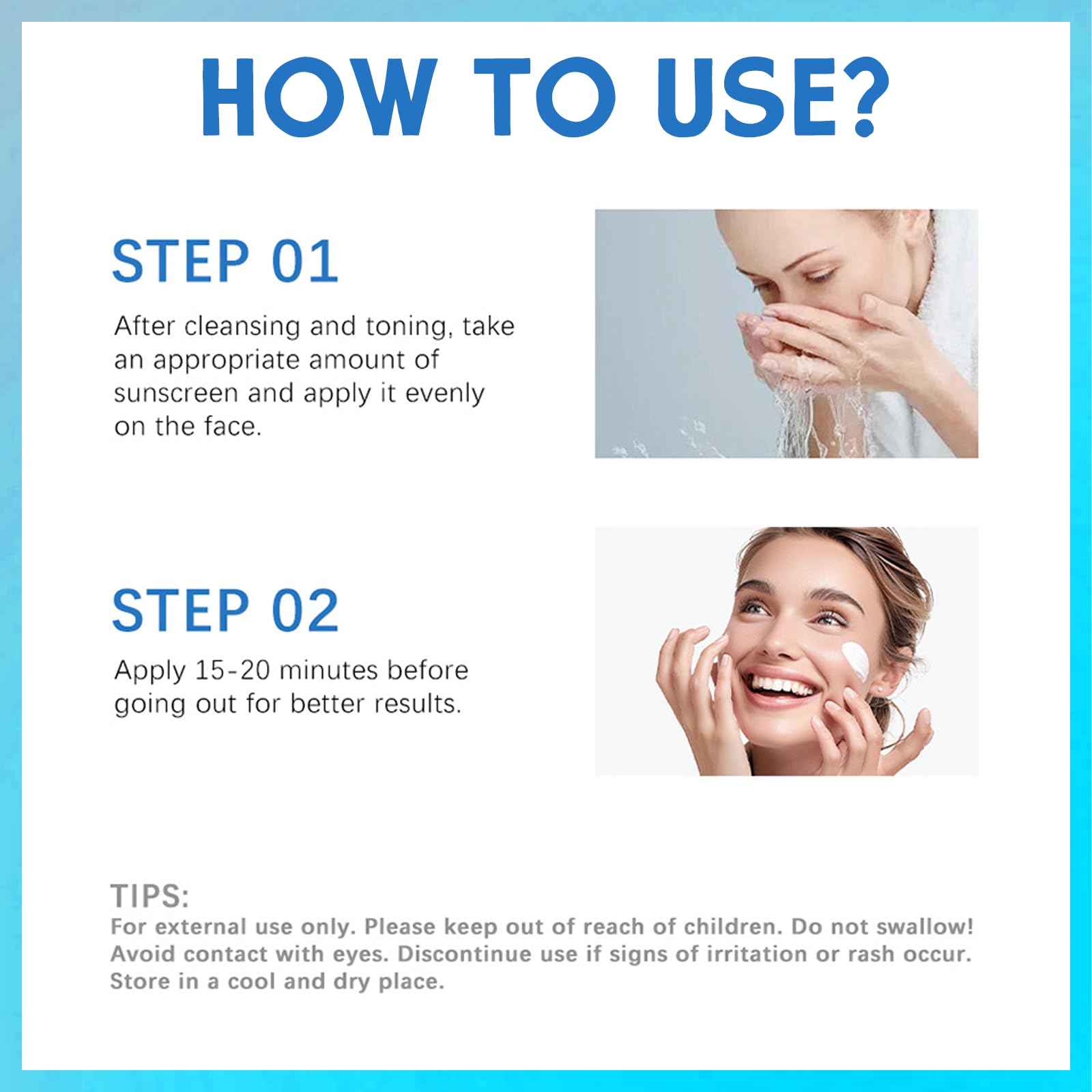 4. Make-up base and stand-alone use: This sunscreen can be used as a make-up base or on its own to help you create a fresh, natural look.
