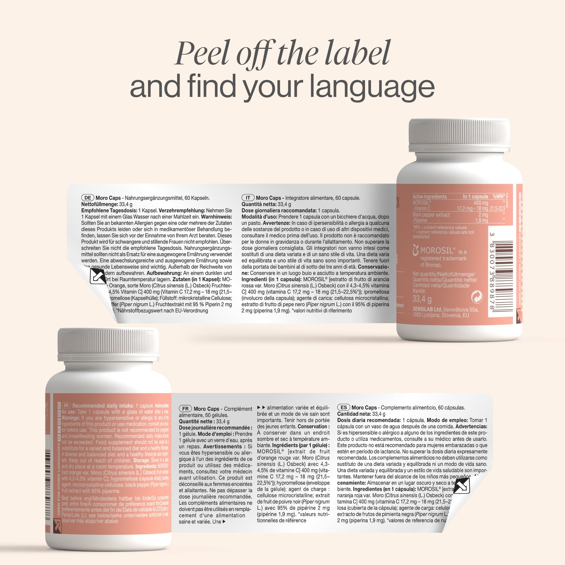 Morosil capsules get their power from a patented red-orange extract from the juice of the most pigmented red orange of the Moro variety from Sicily. Its distinctive red colour comes from special phytochemicals called anthocyanins. Moro Caps from TummyTox are packed with 400 mg of Morosil red-orange extract. Moro red oranges are also high in vitamin C, which is the key player in energy production and reducing tiredness and fatigue. To strengthen the power of Morosil red-orange extract, our development team took the next step and added black pepper extract. Black pepper extract improves the bioavailability of other herbal ingredients! But that’s not all – black pepper extract also boosts thermogenesis." We only use premium quality ingredients to help you conquer your day and crush your workouts. Gluten-free, lactose-free, GMO-free, and suitable for vegetarians and vegans. Manufactured in the EU - Moro Caps by TummyTox is a 100% natural product manufactured in accordance with the strictest pharmaceutical standards in compliance with GMP and HACCP food safety management systems. All raw materials and end products are subject to careful control and have been subjected to microbiological and heavy metal analyses. Developed and manufactured in Sensilab (SI) - with 15 years of experience in the development and production of dietary supplements.More Info
