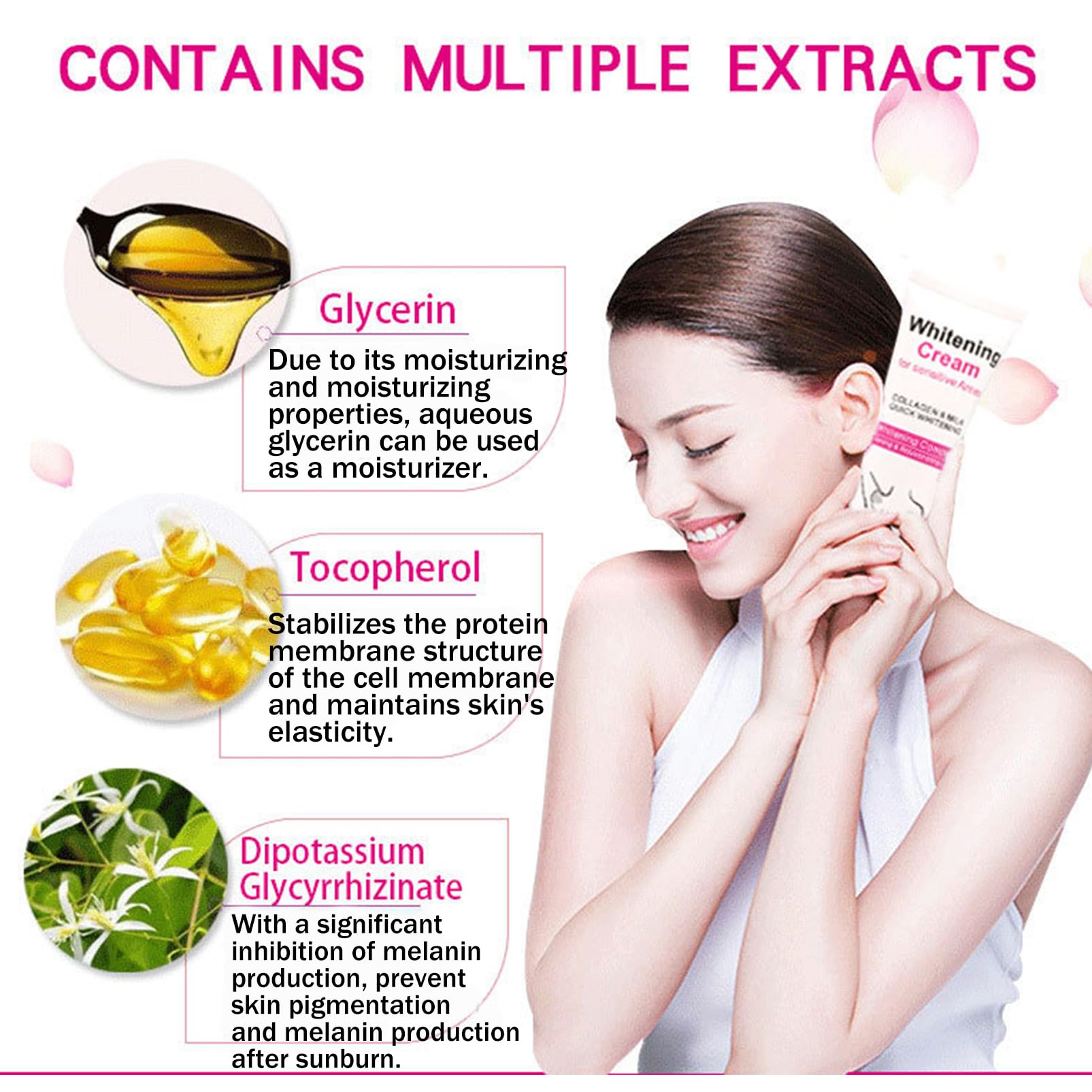 Skin bleach cream is made of all natural ingredients, rich in Vitamin E, which have the function of antioxidant, protect skin from ultraviolet rays and pollution, reduce pigment deposition, accelerate wound healing and reduce wrinkles, brighten dull skin, make your skin shine and smooth!