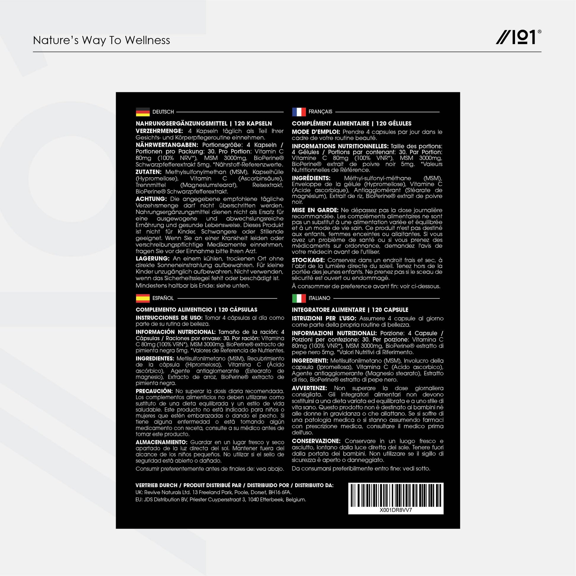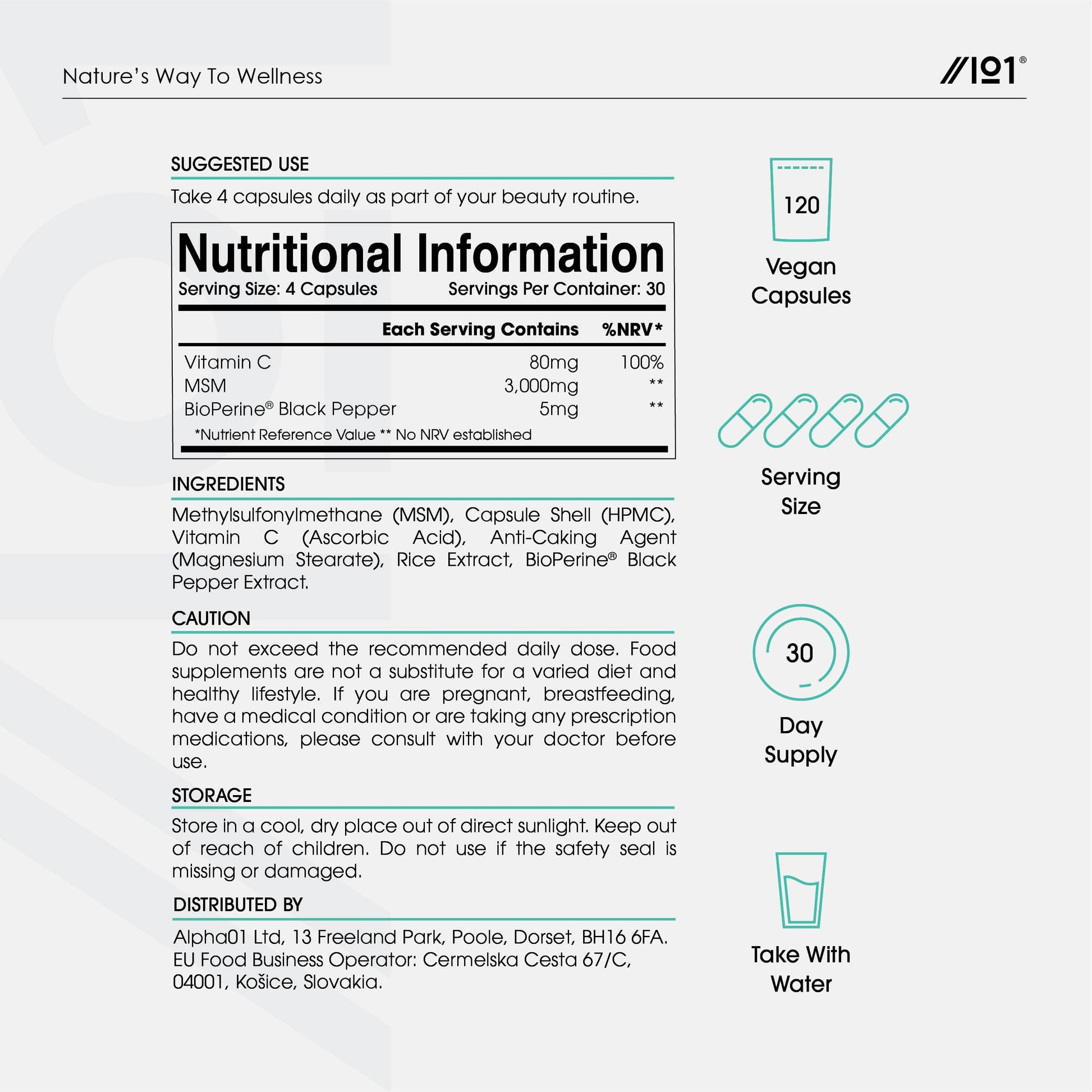 Methylsulfonylmethane, more commonly known as MSM, is an organic compound that provides a source of natural sulphur. Sulphur is the third most abundant element in the body and can be found in tissues, such as cartilage, tendons and ligaments. For maximum results, we have provided an impressive 3,000mg (the clinically-researched dose) in every daily serving. This high strength formula also contains Vitamin C, an essential nutrient that supports collagen formation in the body, promotes the health of skin, teeth, gums and bones, helps to reduce tiredness and fatigue, and helps to maintain a healthy immune system. The bioavailability of the ingredients has also been enhanced by the inclusion of BioPerine black pepper, which increases its absorption and utilisation in the body. Always fair trade and non-GMO, this supplement is made from premium ingredients sourced in Europe and meets all food safety requirements.More Info