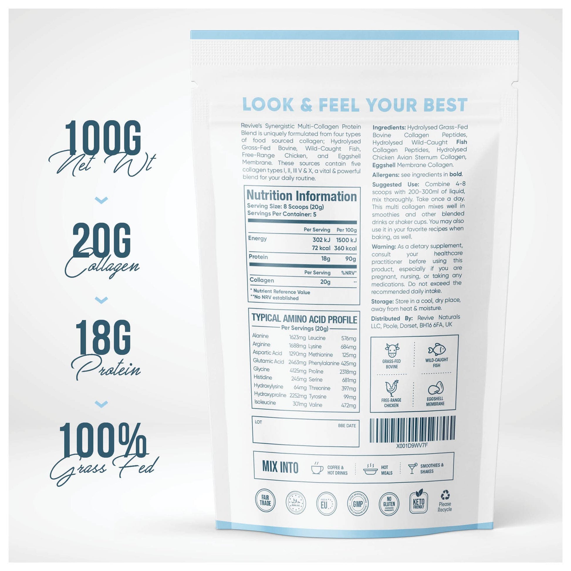 Multi Collagen Protein Powder (100g) - Types I, II, III, V & X - Hydrolyzed Grass Fed Bovine, Wild Caught Fish, & Free-Range Chicken & Eggshell Collagen (5 Day Supply)