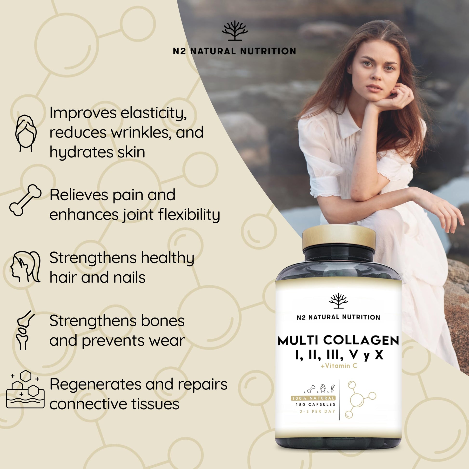 Multi Collagen Type I, II, III, V, X. Bovine, Marine Collagen Peptides 180 Capsules Enhanced with Vitamin C, for Joint Care, Skincare & Hair High Strength Collagen for Women & Men N2 Natural Nutrition